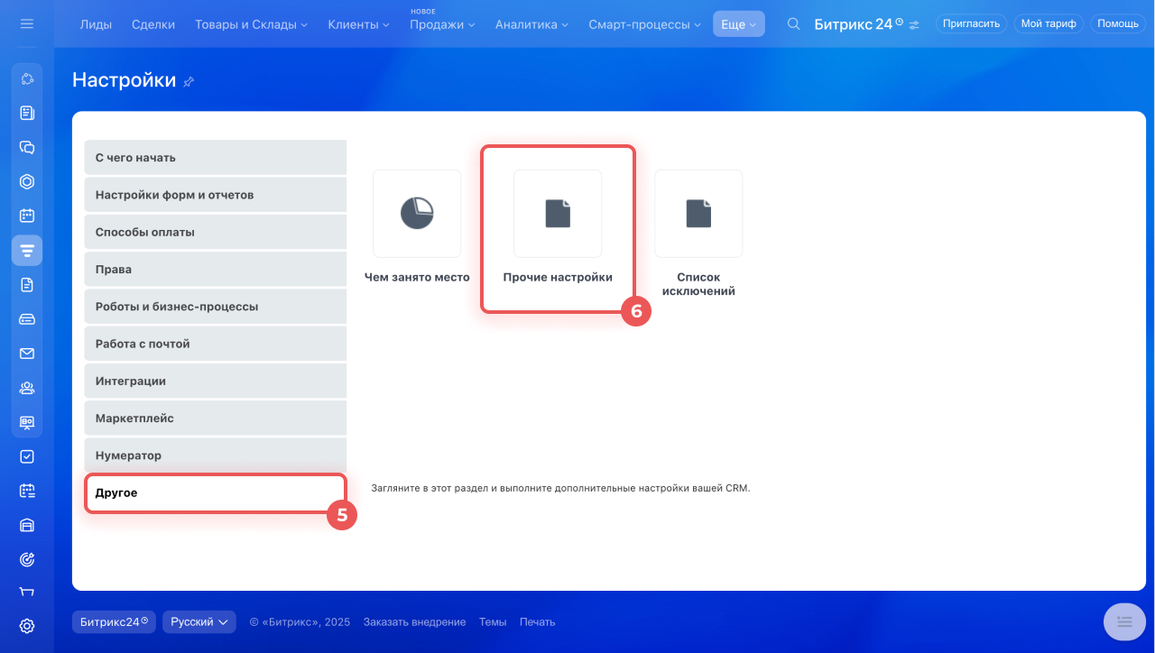 Перейдите в CRM > Еще > Настройки > Настройки CRM > Другое > Прочие настройки.