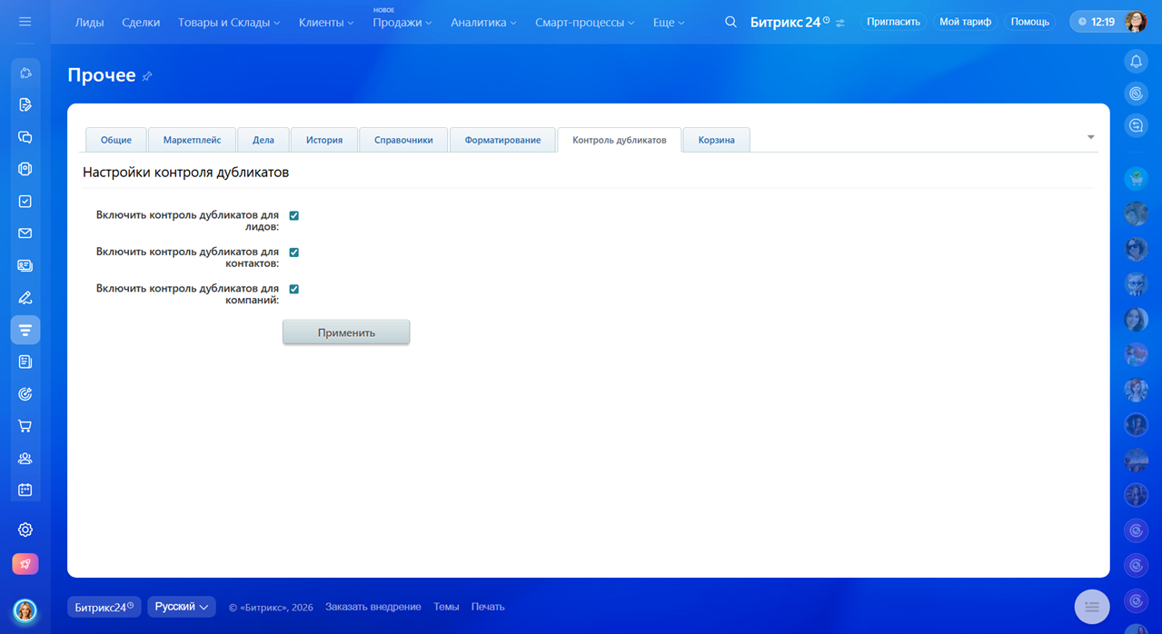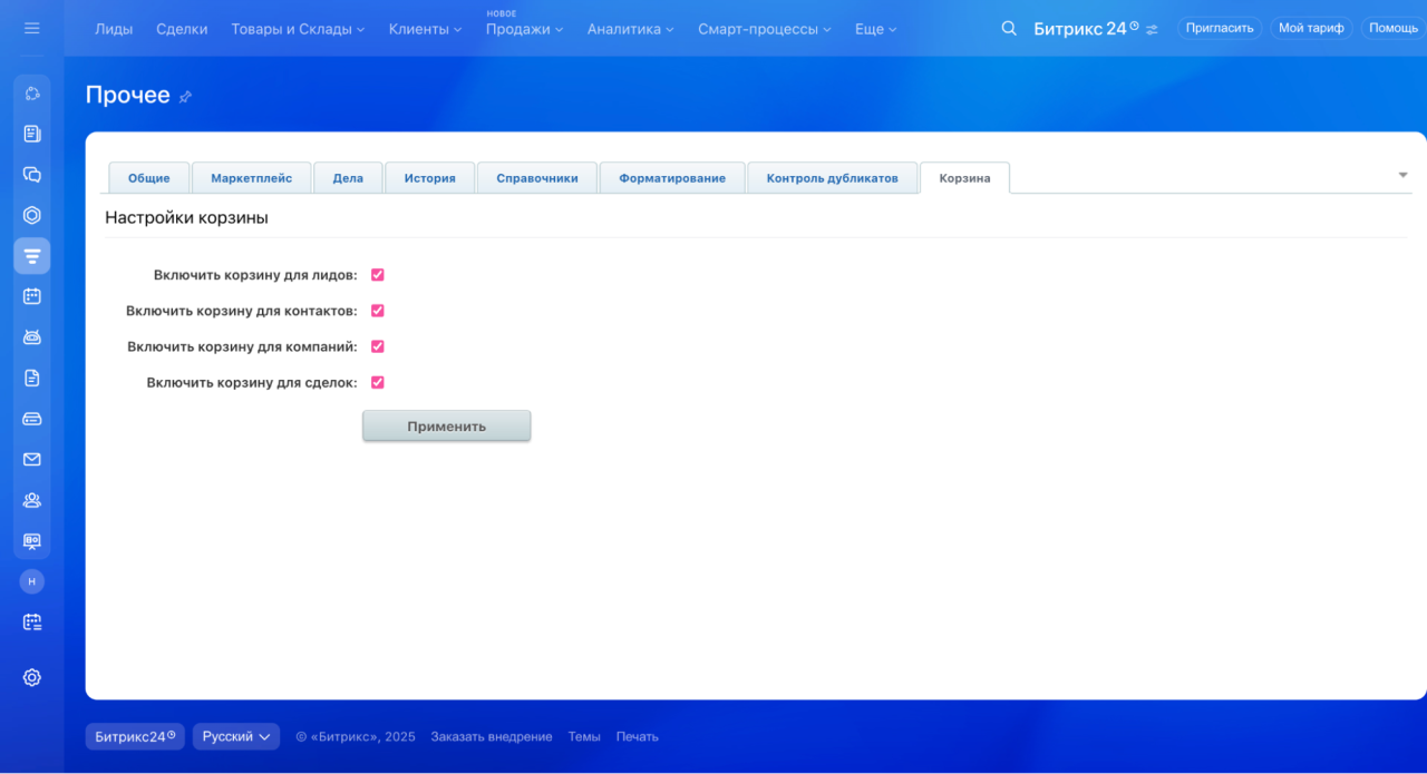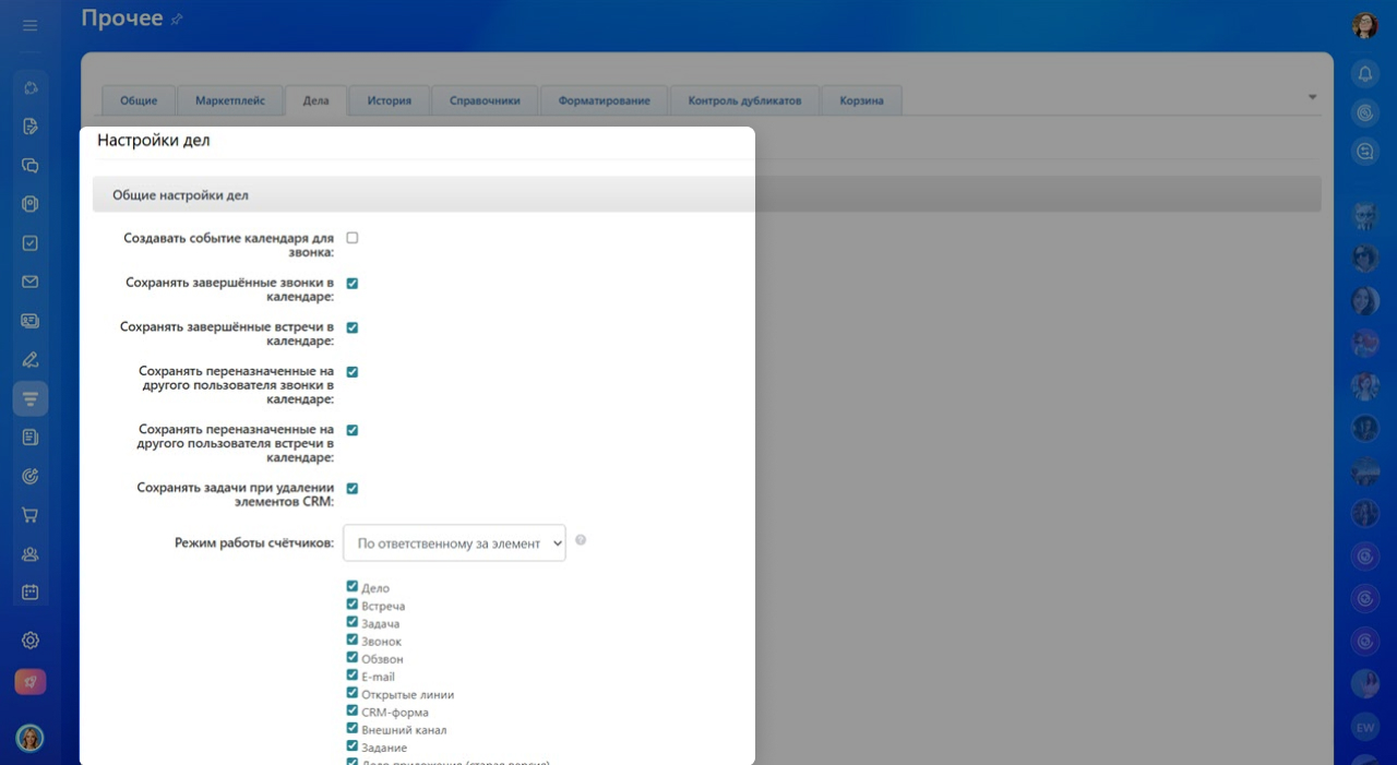 В разделе Прочие настройки собраны дополнительные параметры, которые помогают адаптировать CRM под задачи вашей компании. Здесь можно настроить отображение элементов, определить правила обработки дубликатов, управлять делами, корзиной и так далее.