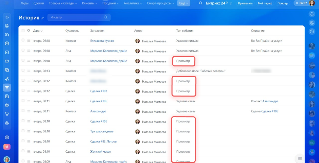 В истории CRM хранится информация об основных изменениях, которые происходили с элементами. Например, можно отследить, кто удалил контакт или кто экспортировал список сделок.