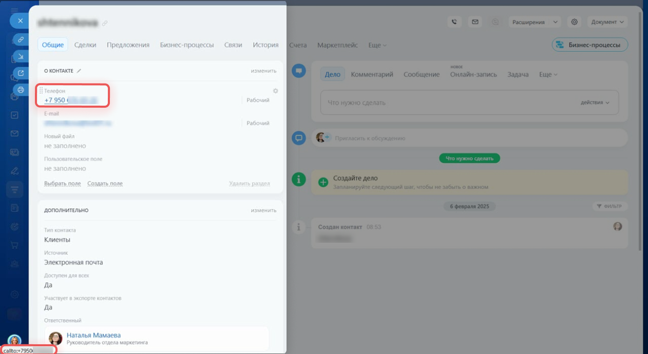 Формат вывода ссылок callto. Настройка определяет, что происходит при клике на номер телефона в карточке CRM. Номер телефона в карточках контактов и компаний — это кликабельная ссылка. По умолчанию звонок выполняется через встроенную телефонию Битрикс24.