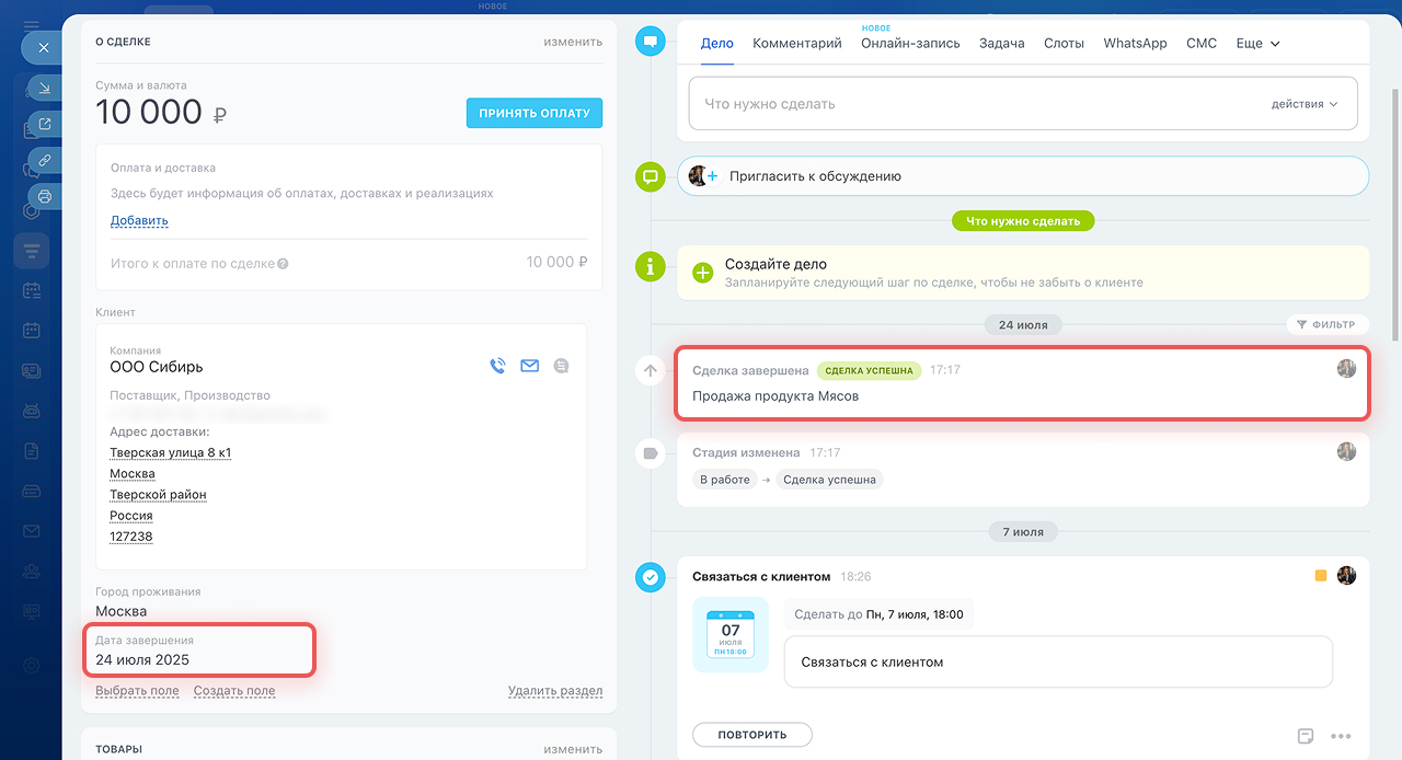 Это помогает не перегружать карточки и списки устаревшей информацией. Сами дела при этом остаются в CRM.