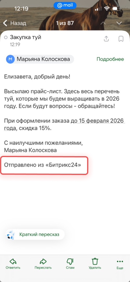 Добавлять подпись «Отправлено из Битрикс24». По умолчанию эта подпись добавляется ко всем письмам, отправленным из CRM. Ее можно отключить. Например, если вы используете свою корпоративную подпись и не хотите указывать сервис отправки.