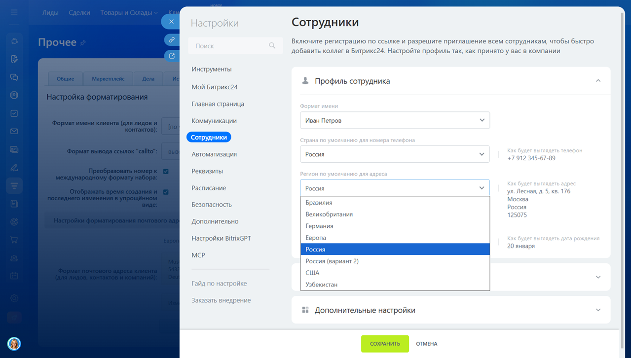 Чтобы изменить регион, перейдите в настройки Битрикс24. Нажмите Сотрудники > Профиль сотрудника и выберите страну по умолчанию для адреса.