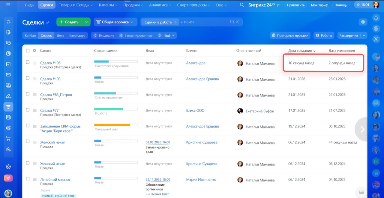 Отображать время создания и последнего изменения в упрощенном виде. Настройка отвечает за то, как отображается время в CRM. Если она включена, вместо точной даты и времени вы увидите относительное значение — например, «13 секунд назад». Если выключена — будет отображаться точное время создания и изменения элемента.