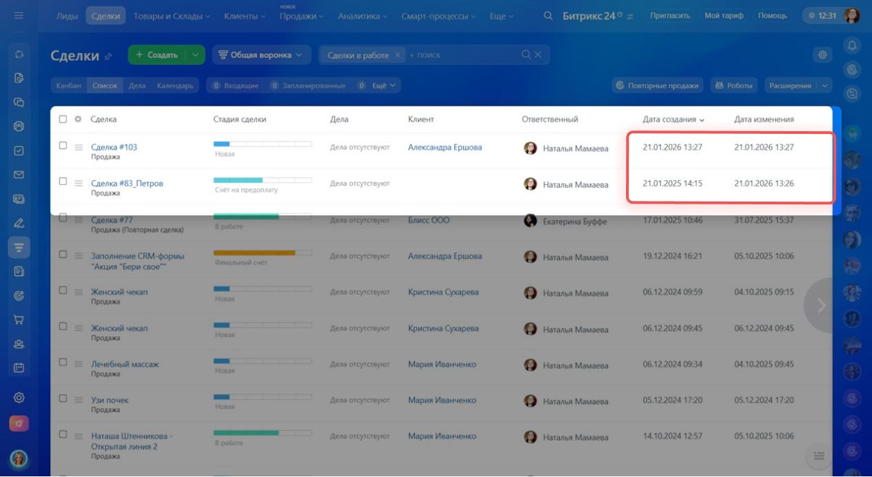 Настройка влияет на отображение времени в карточках и в списках CRM и не меняет сами данные, а только способ их показа.