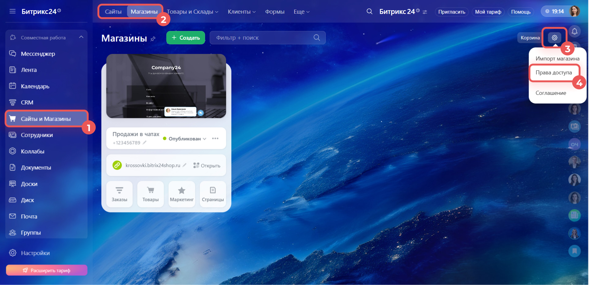 - Чтобы настроить права доступа, перейдите в Сайты и магазины > Сайты или Магазины. Нажмите Настройки (⚙️) в правом верхнем углу и выберите Права доступа.