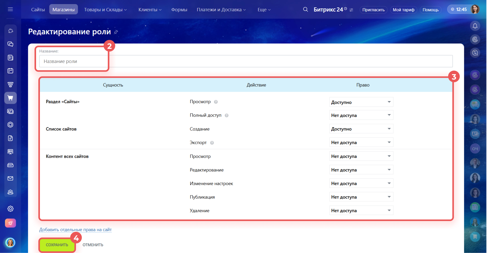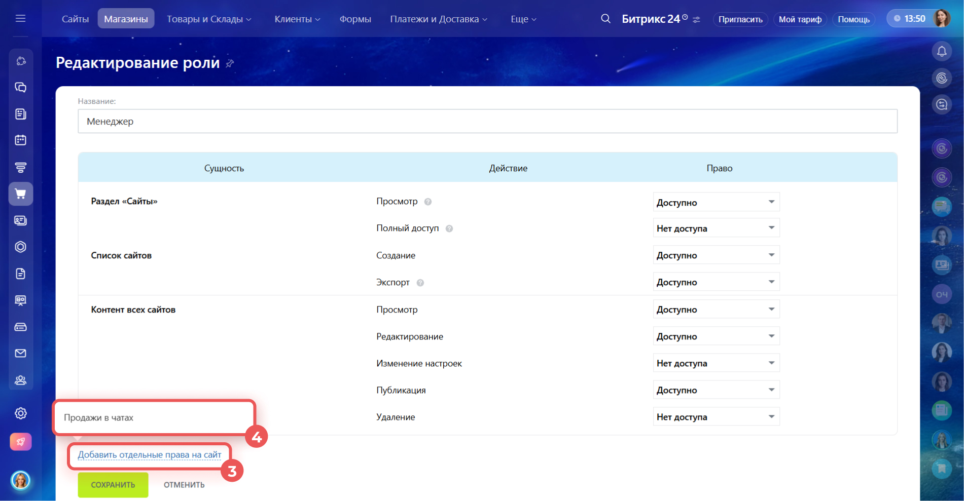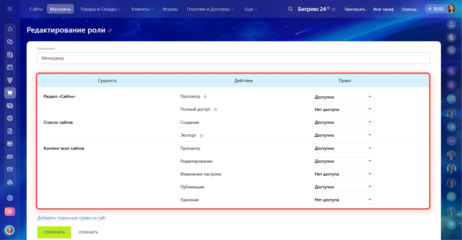 - Для каждой роли можно настроить права доступа на действия с разделом Сайты и магазины, контентом всех сайтов и магазинов и конкретным сайтом или магазином.