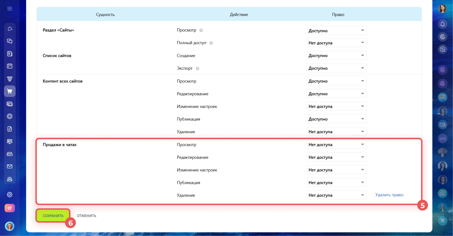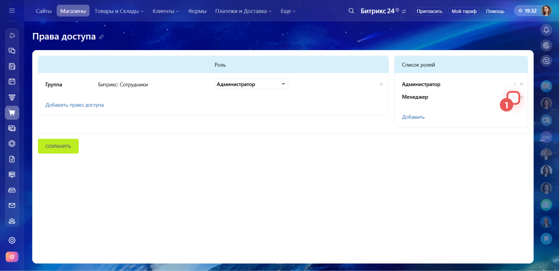 Права доступа для сайтов и интернет-магазинов общие. Если изменить их в разделе Сайты, они применятся и к разделу Магазины. Открыть настройки можно в любом из этих разделов.