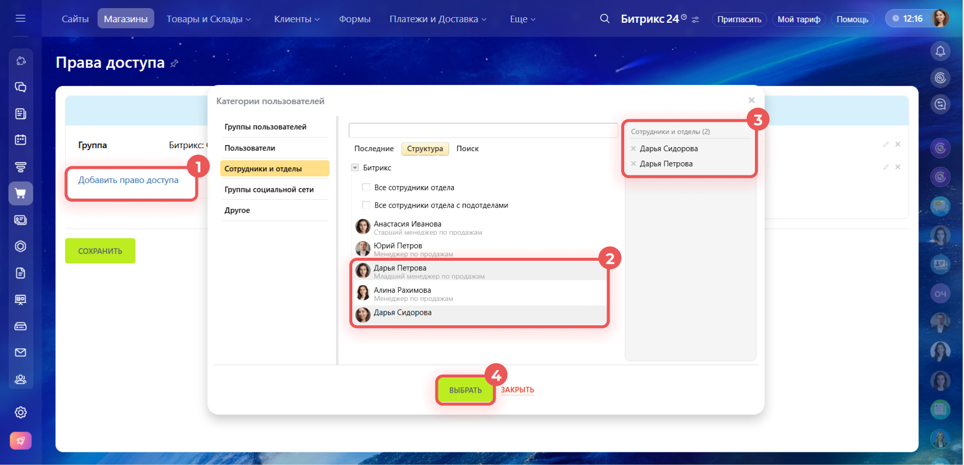 1–4. Нажмите Добавить право доступа. Выберите сотрудника, отдел или группу — они появятся в списке справа. Нажмите Выбрать, чтобы перейти к выбору ролей.