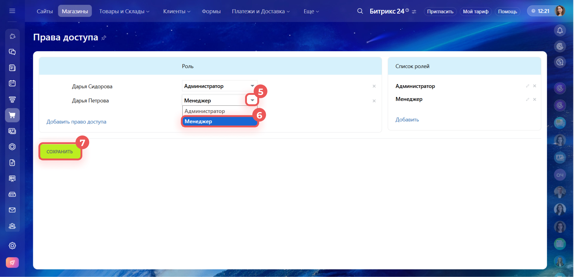 5–7. Нажмите на стрелку напротив сотрудника, отдела или группы и выберите роль. Например, если сотрудник создает страницы и наполняет их товарами, можно назначить ему роль Контент-менеджер, для которой включены права на просмотр раздела и контента сайтов, создание и редактирование сайтов. Сохраните изменения.