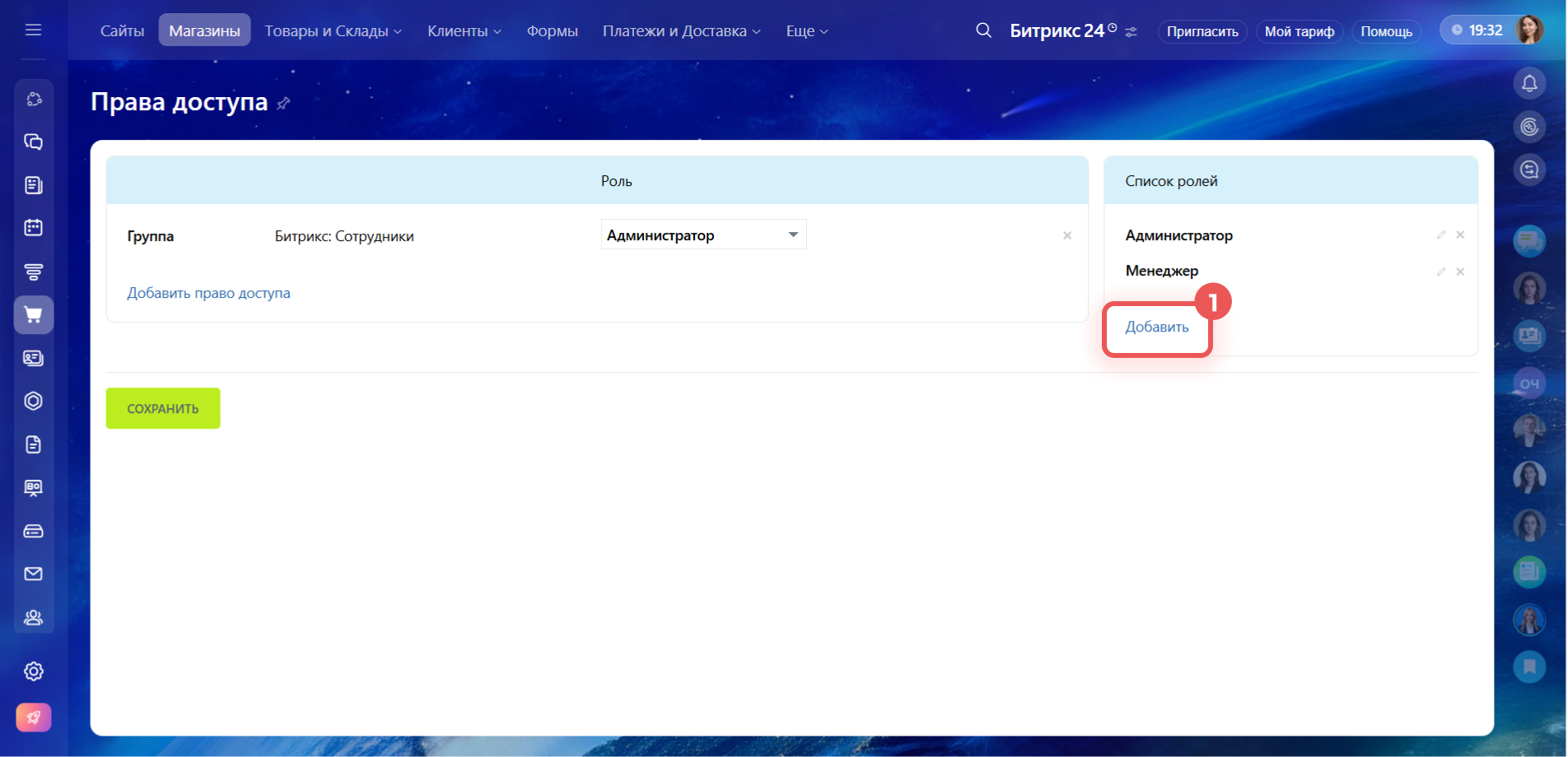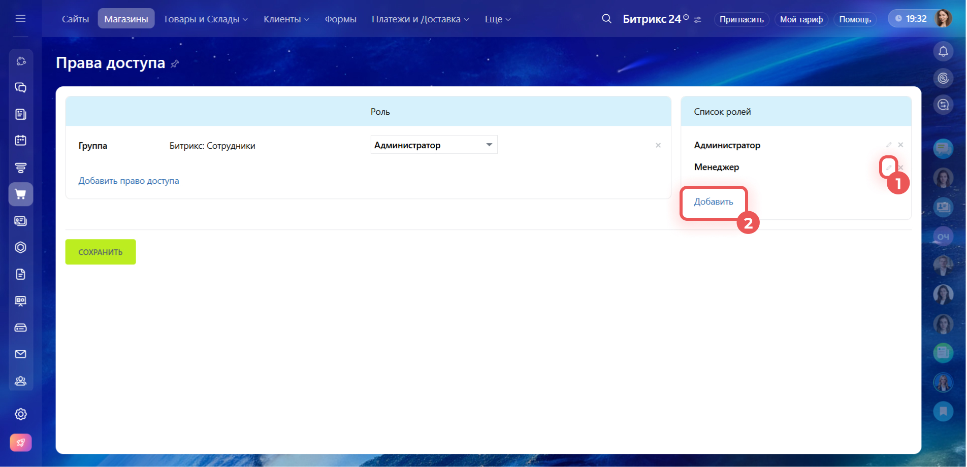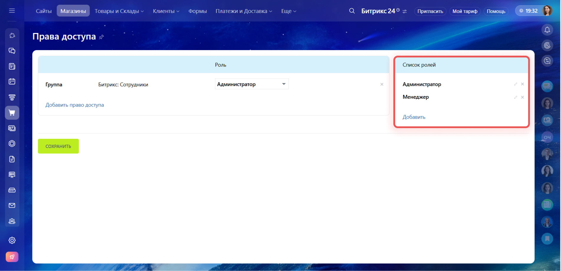 - Администратор — доступны все права, в том числе на изменение ролей и прав доступа для сотрудников.