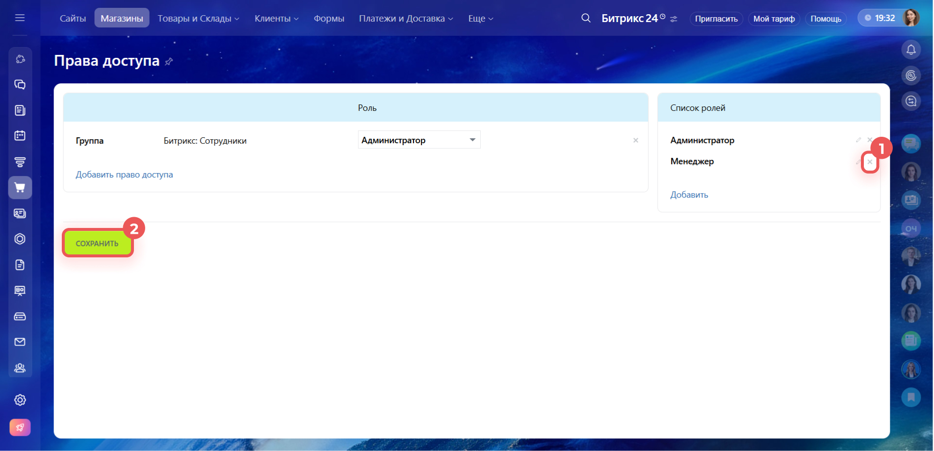 - Права доступа для сайтов и интернет-магазинов общие. Если изменить их в разделе Сайты, они применятся и к разделу Магазины.
