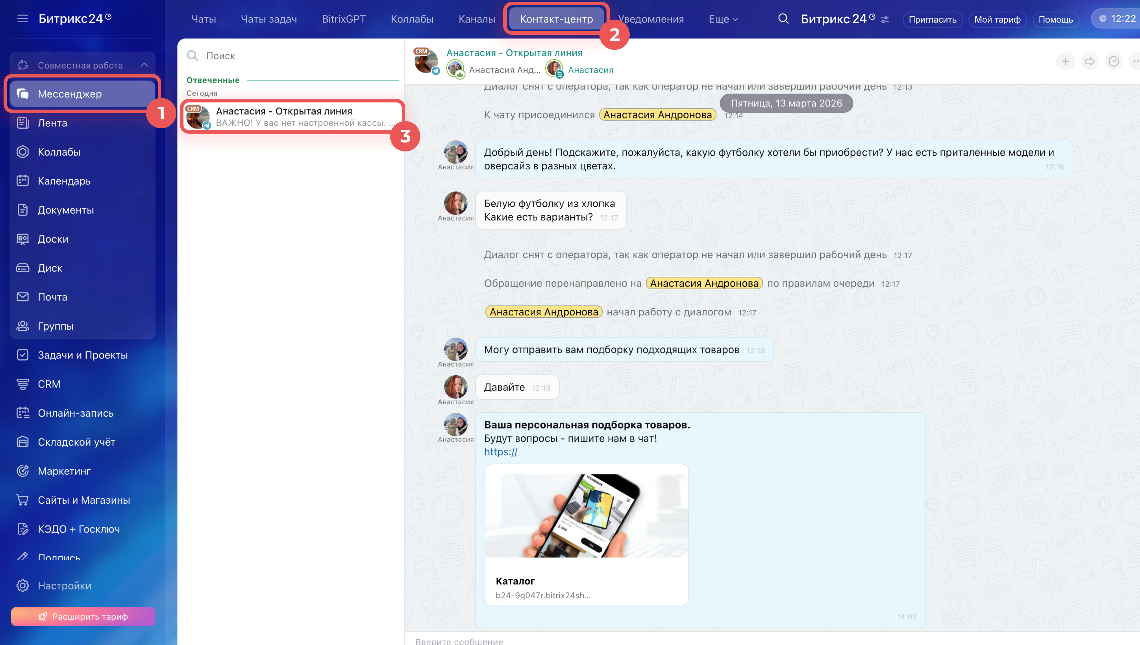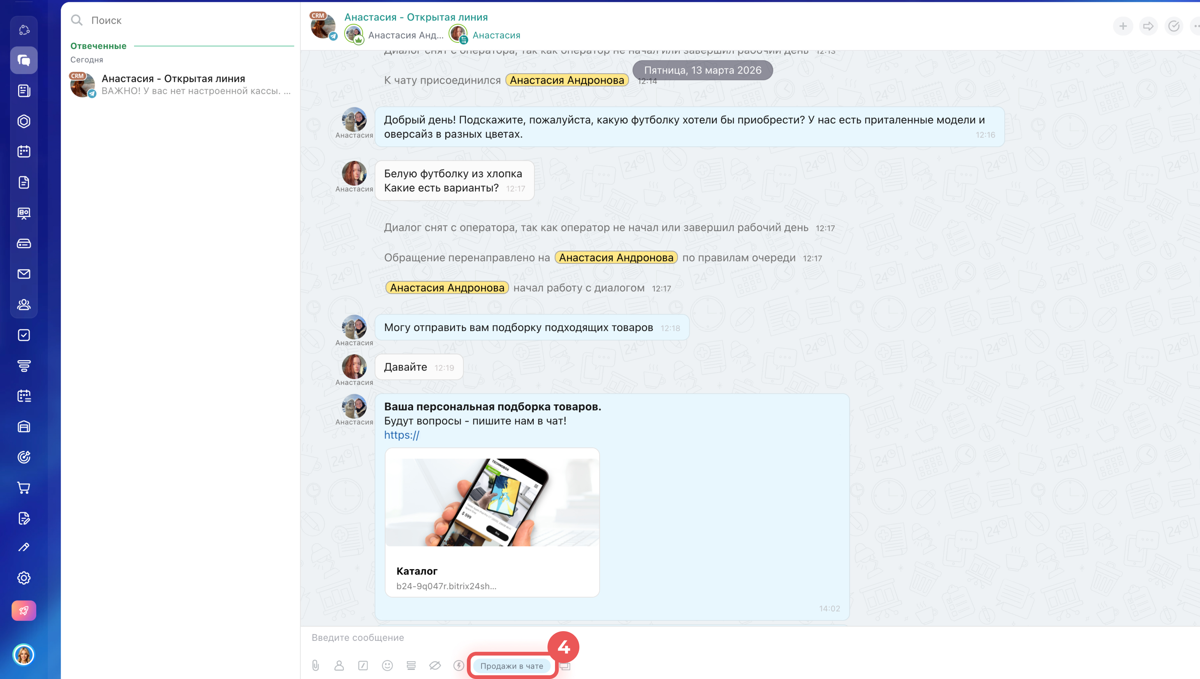 1–4. Перейдите в Мессенджер > Контакт-центр. Откройте чат с клиентом. Внизу нажмите Продажи в чате.