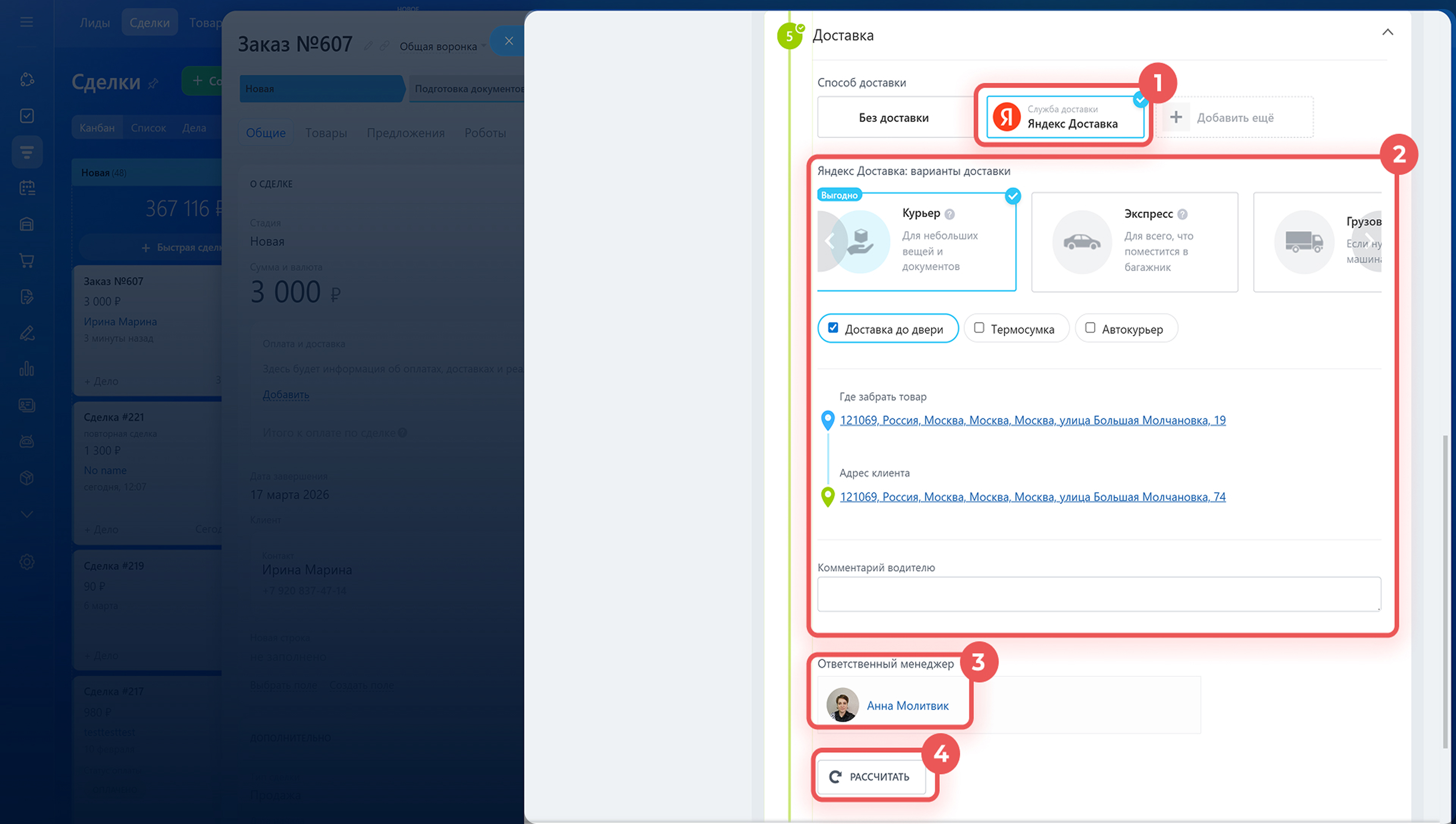 1–2. Выберите службу Яндекс.Доставка и заполните параметры: тип доставки, адреса, комментарий водителю.