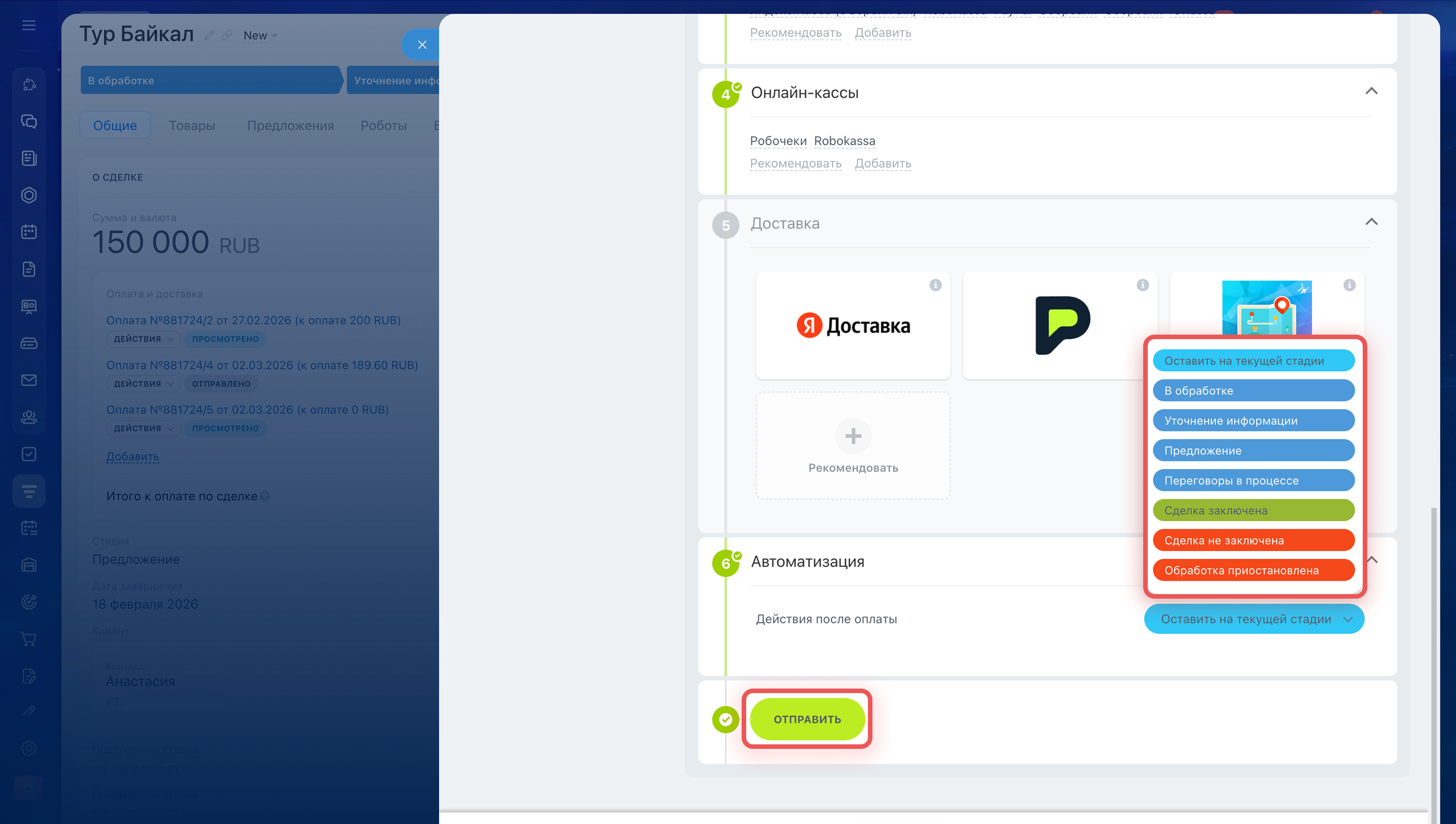 Автоматизация. Выберите, на какую стадию автоматически переместится сделка после оплаты и завершения доставки, чтобы не переносить карточку вручную. По умолчанию карточка остается на текущем этапе.