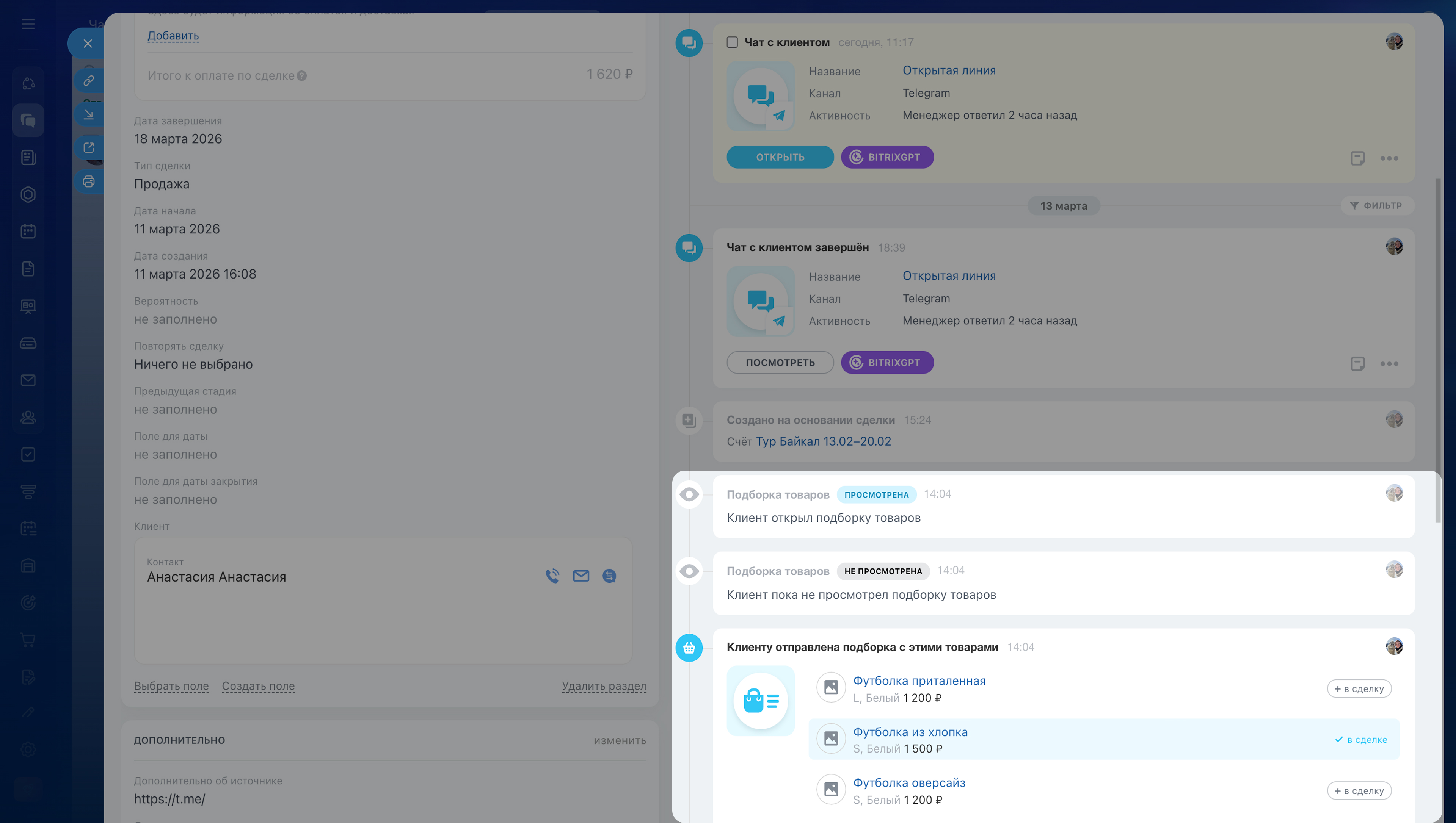 - В сделке видно, как клиент взаимодействует с подборкой: когда он откроет ссылку, появится уведомление, а после оформления заказа выбранные товары добавятся в карточку сделки.