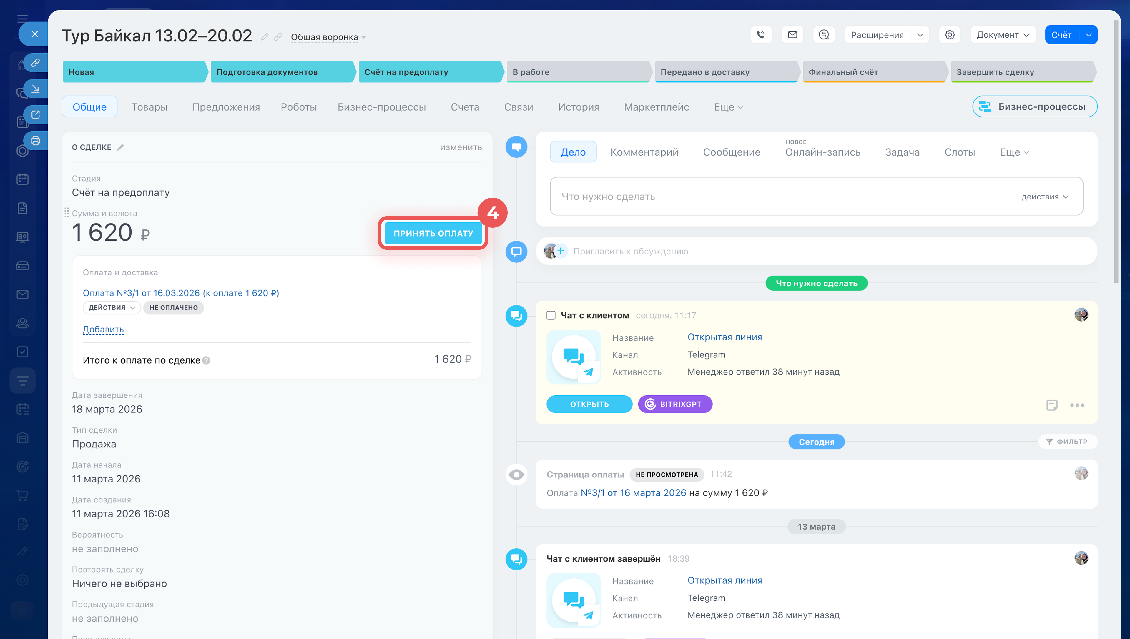 4. В карточке сделки нажмите Принять оплату.