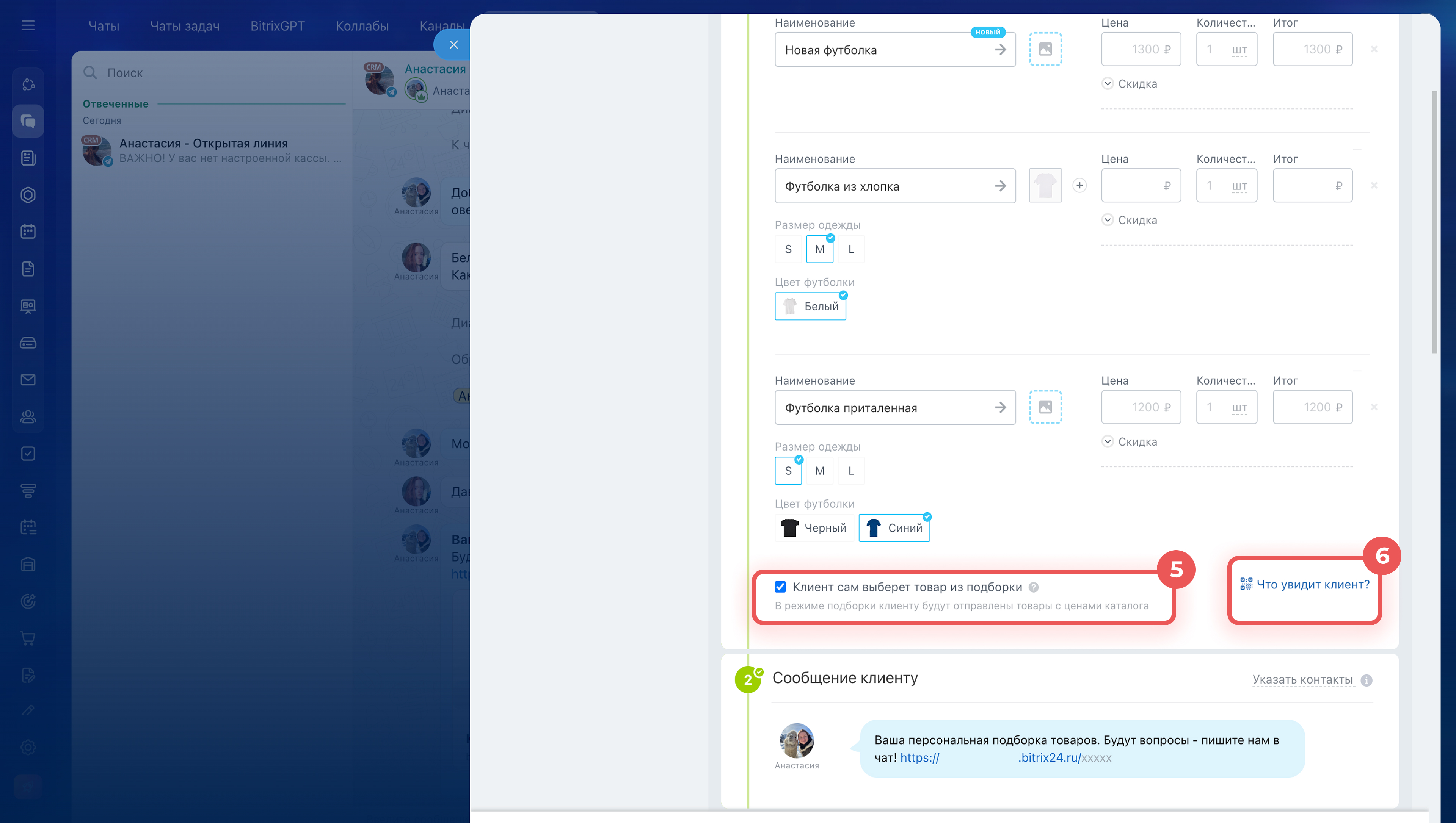В Битрикс24 можно собрать несколько товаров в подборку и отправить клиенту одной ссылкой. Это удобно, когда клиент выбирает из нескольких вариантов — не нужно отправлять каждый товар отдельным сообщением.