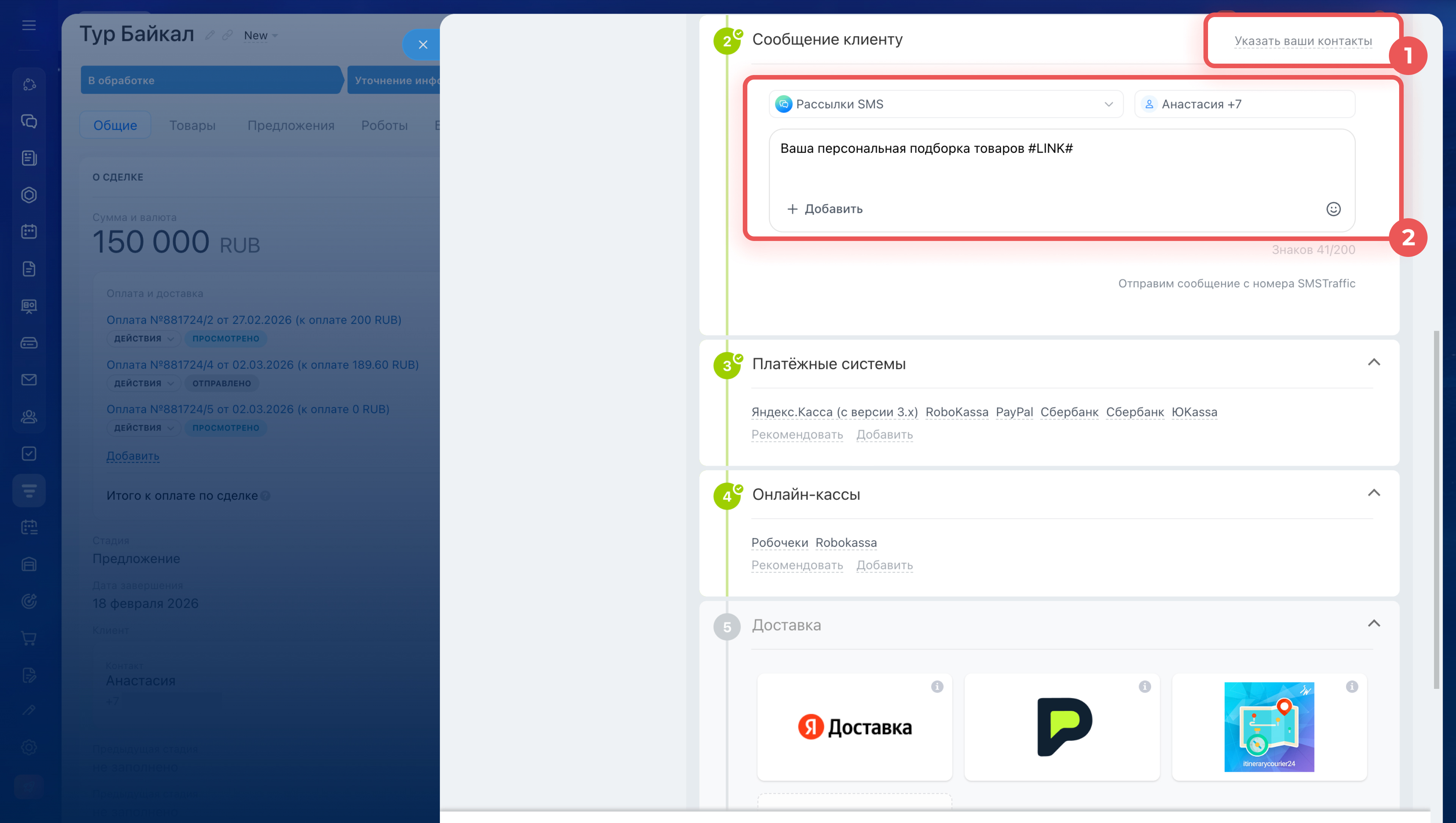 2. Если отправляете сообщение по СМС в сделке: