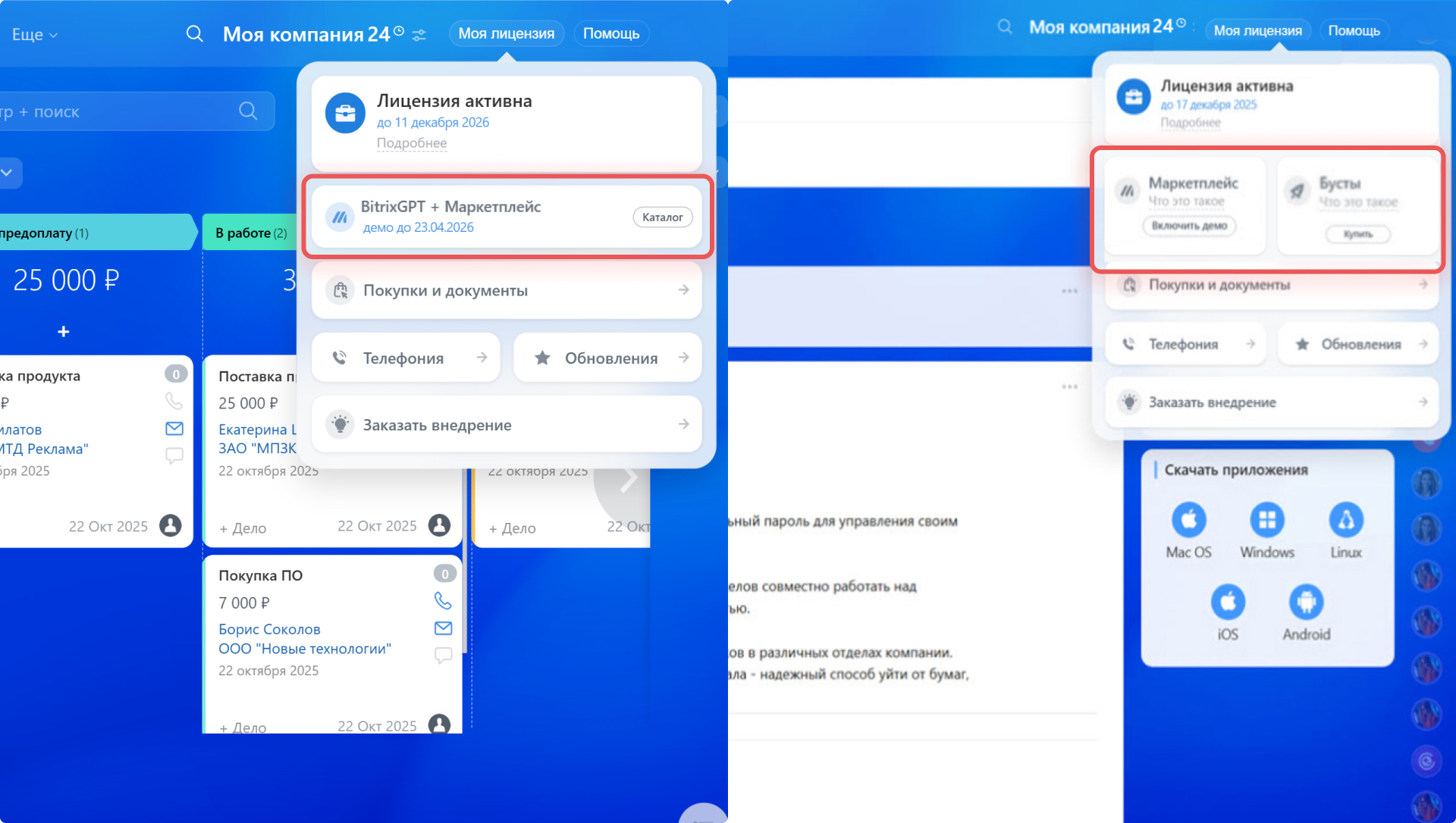 Слева — раздел «Моя лицензия» в Битрикс24 с обновленными модулями, справа — в Битрикс24 без обновлений