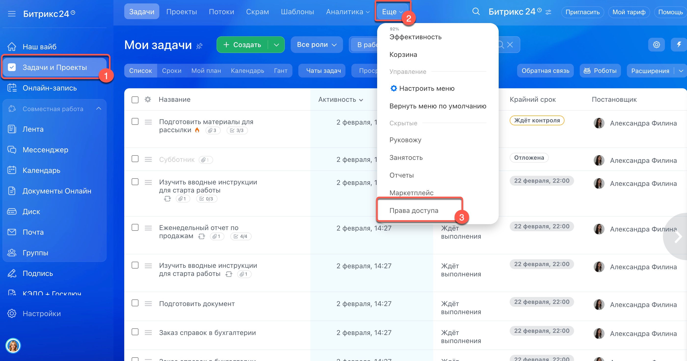 - Настроить права можно в разделе Задачи и проекты > Еще > Права доступа.