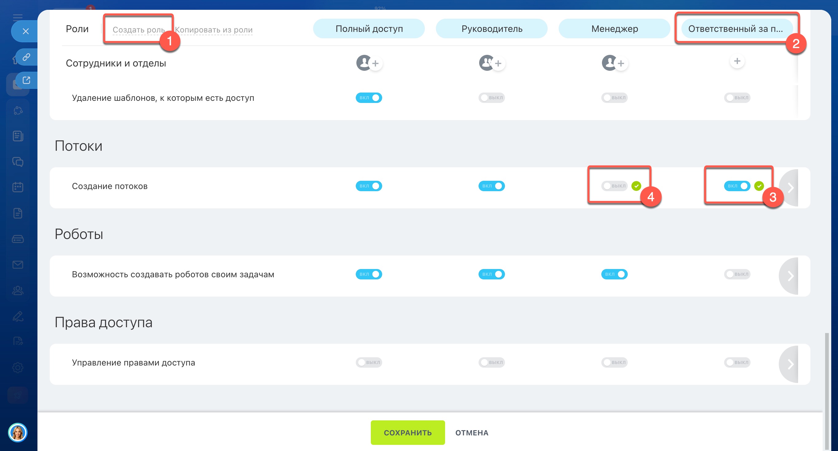 1–3. Создайте новую роль Ответственный за потоки и включите в ней право Создание потоков.
