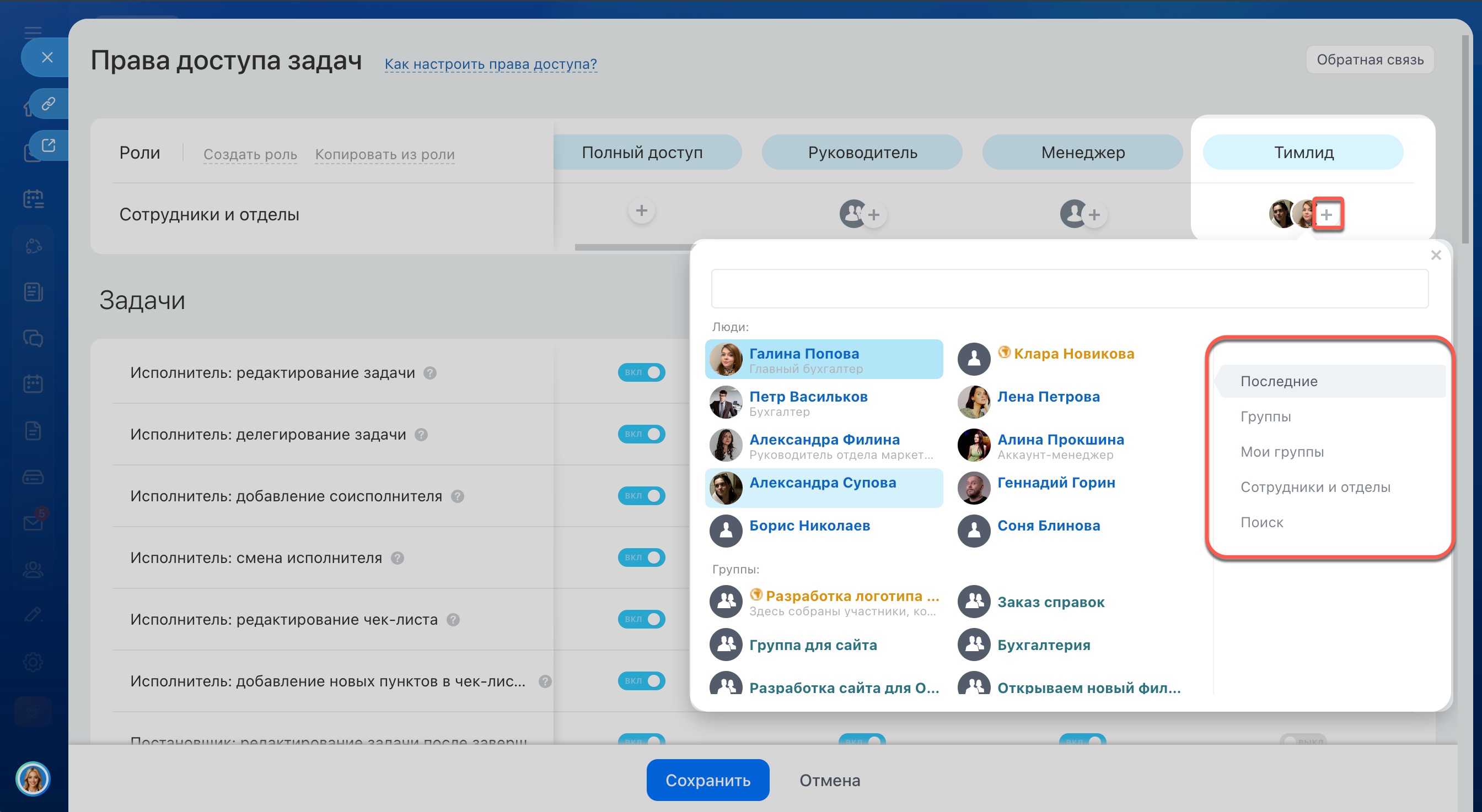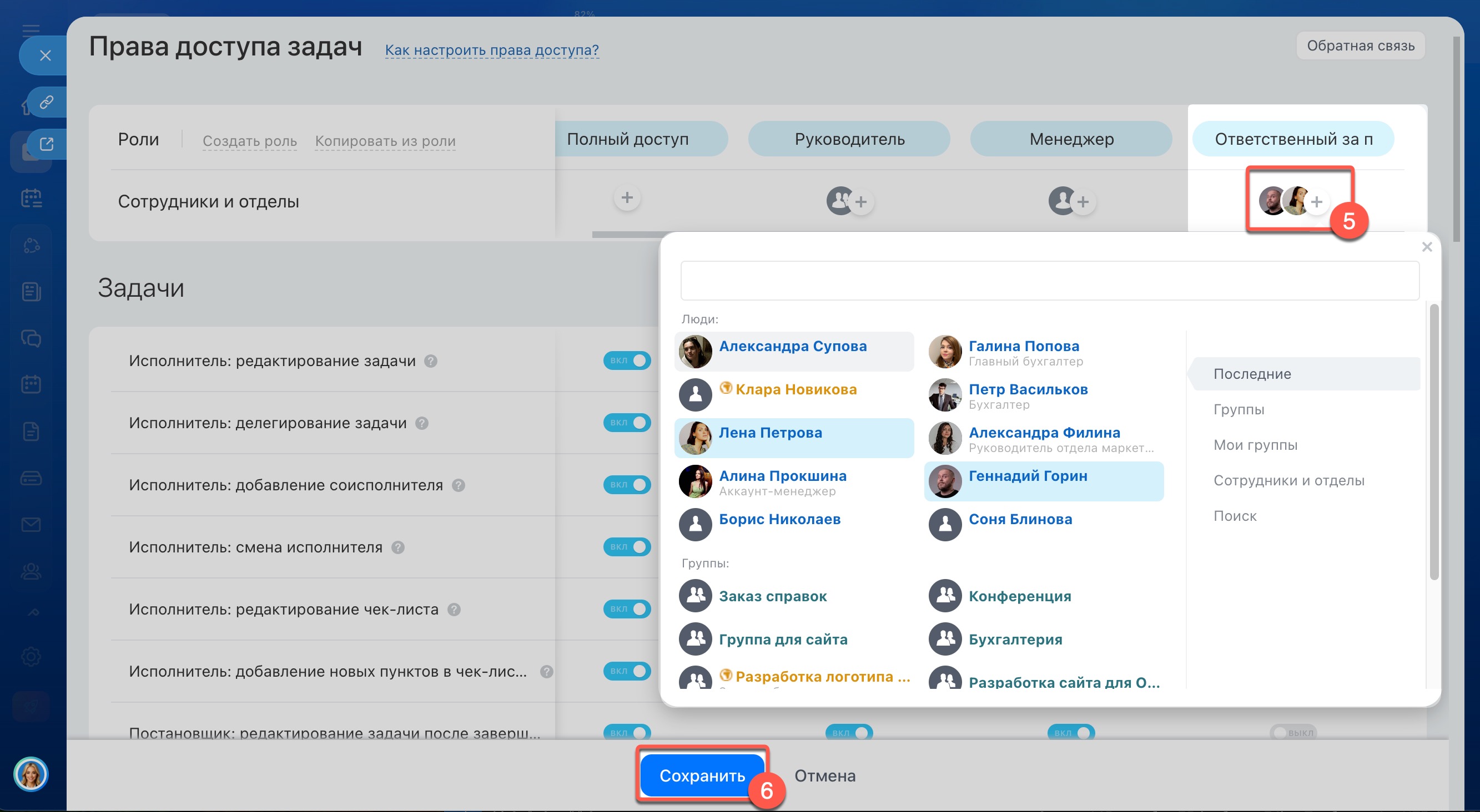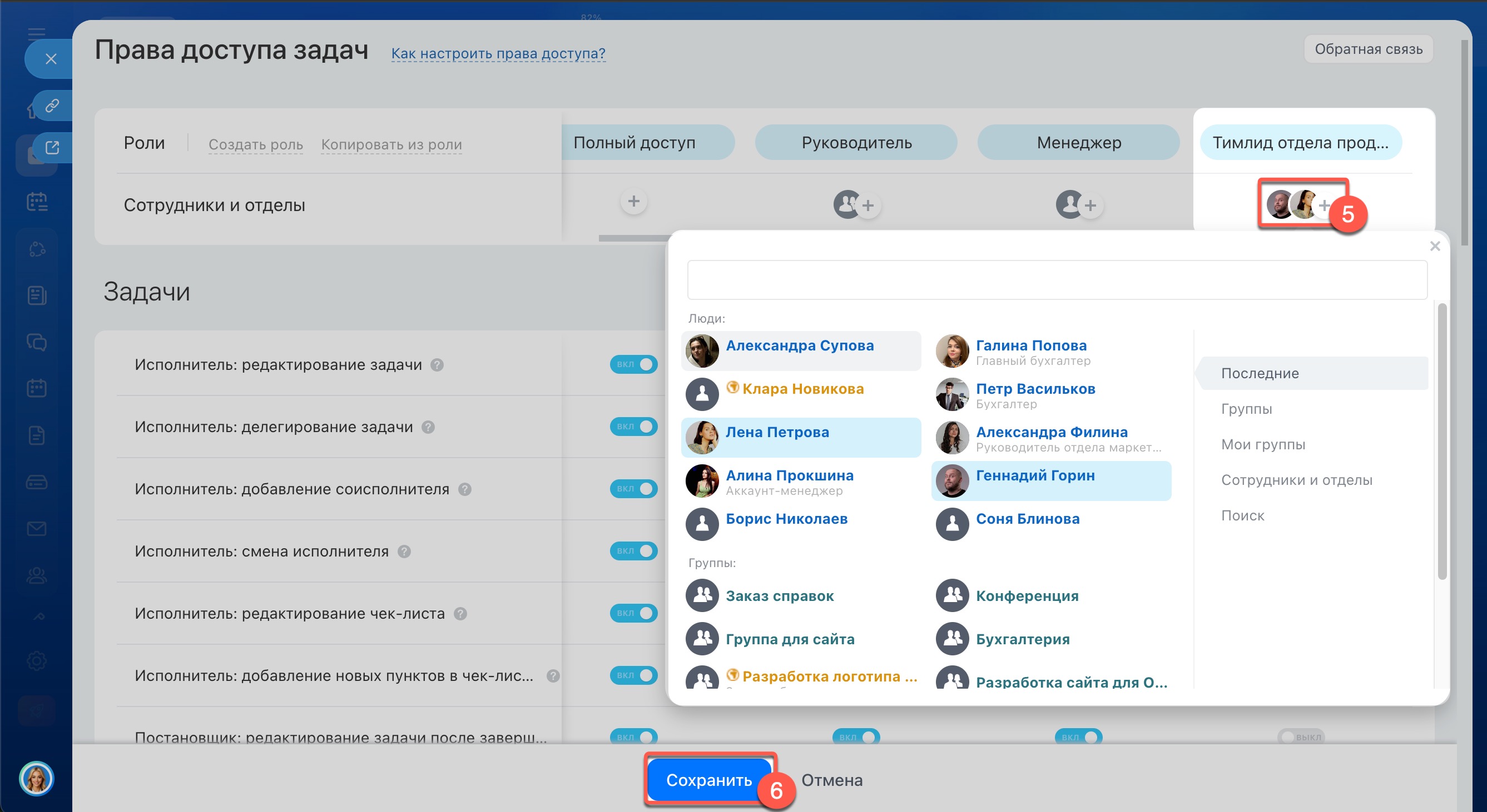 5–6. Добавьте в роль нужных сотрудников, например руководителей или тимлидов и сохраните настройки.