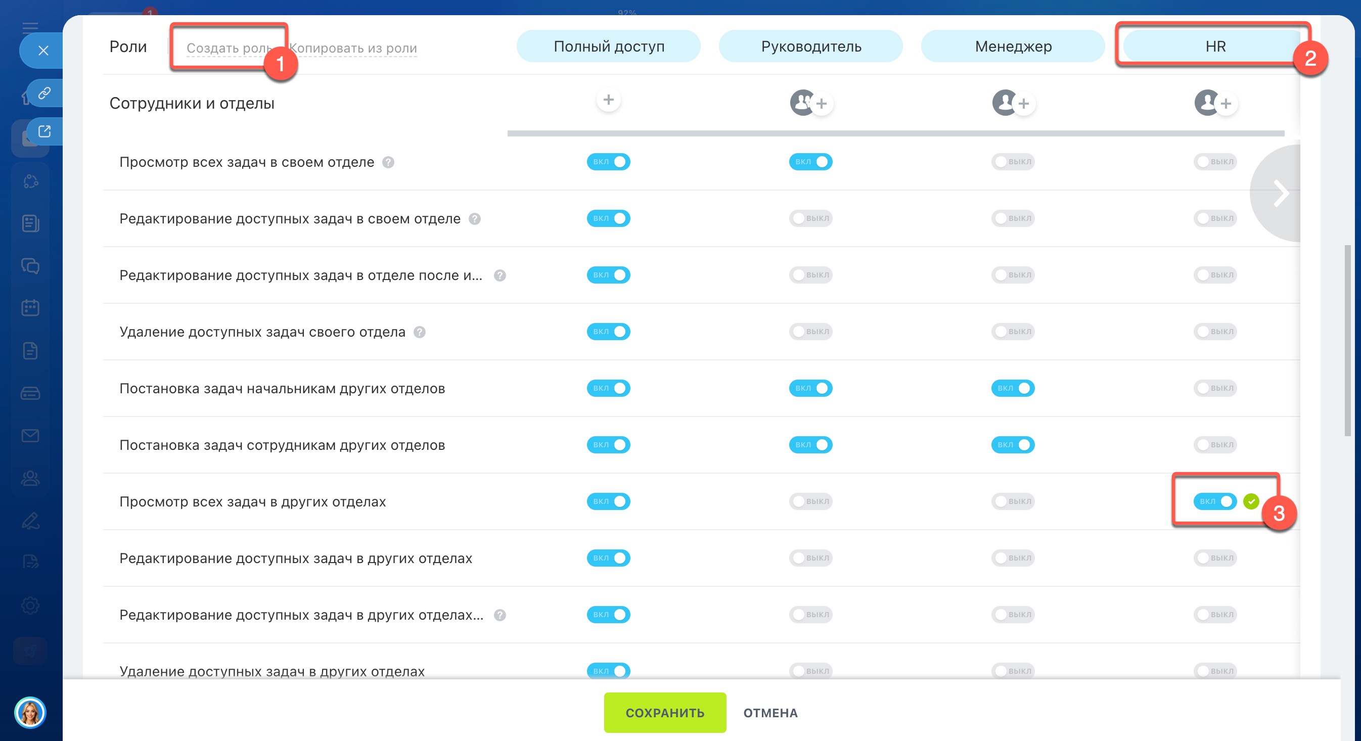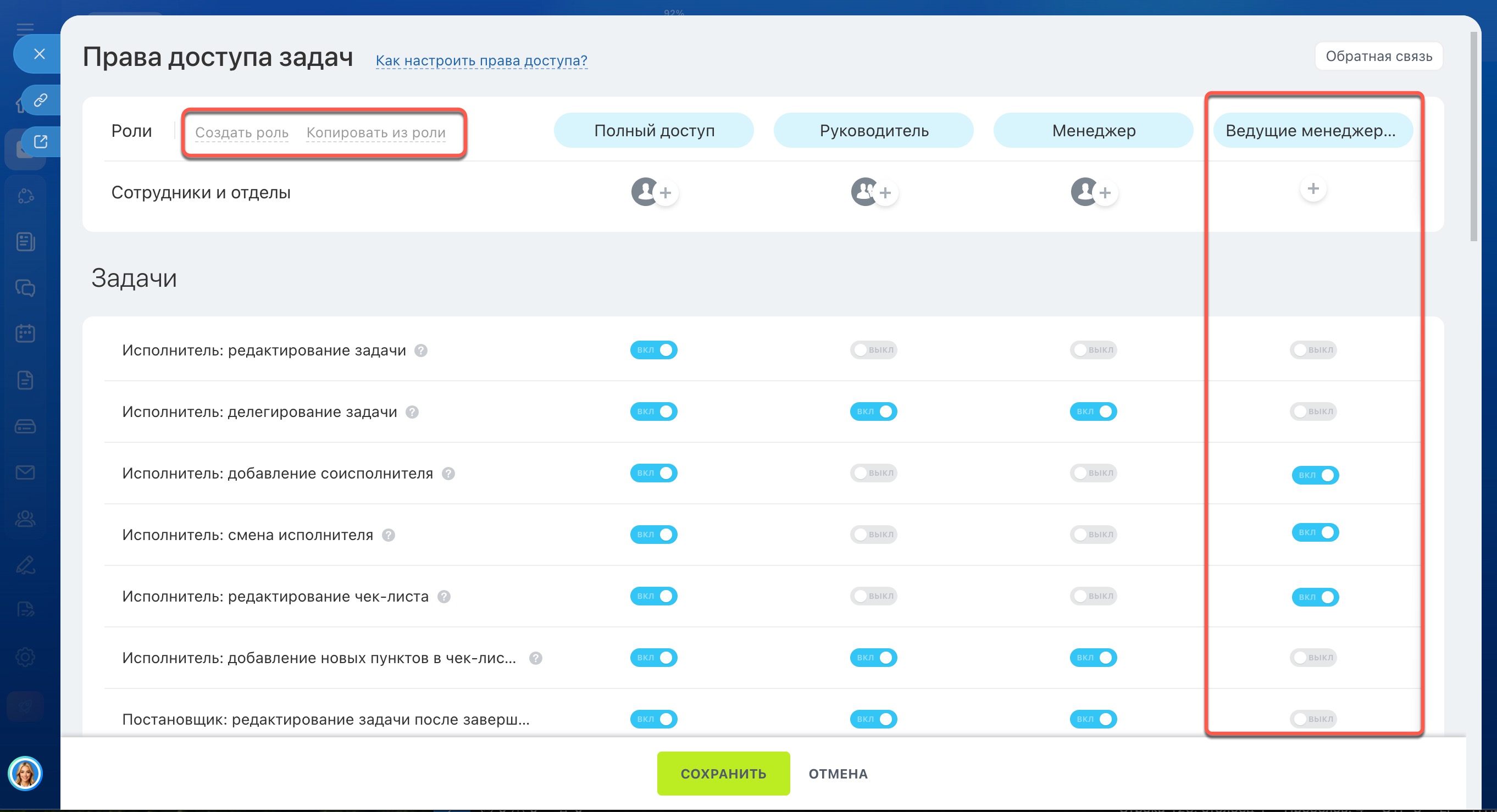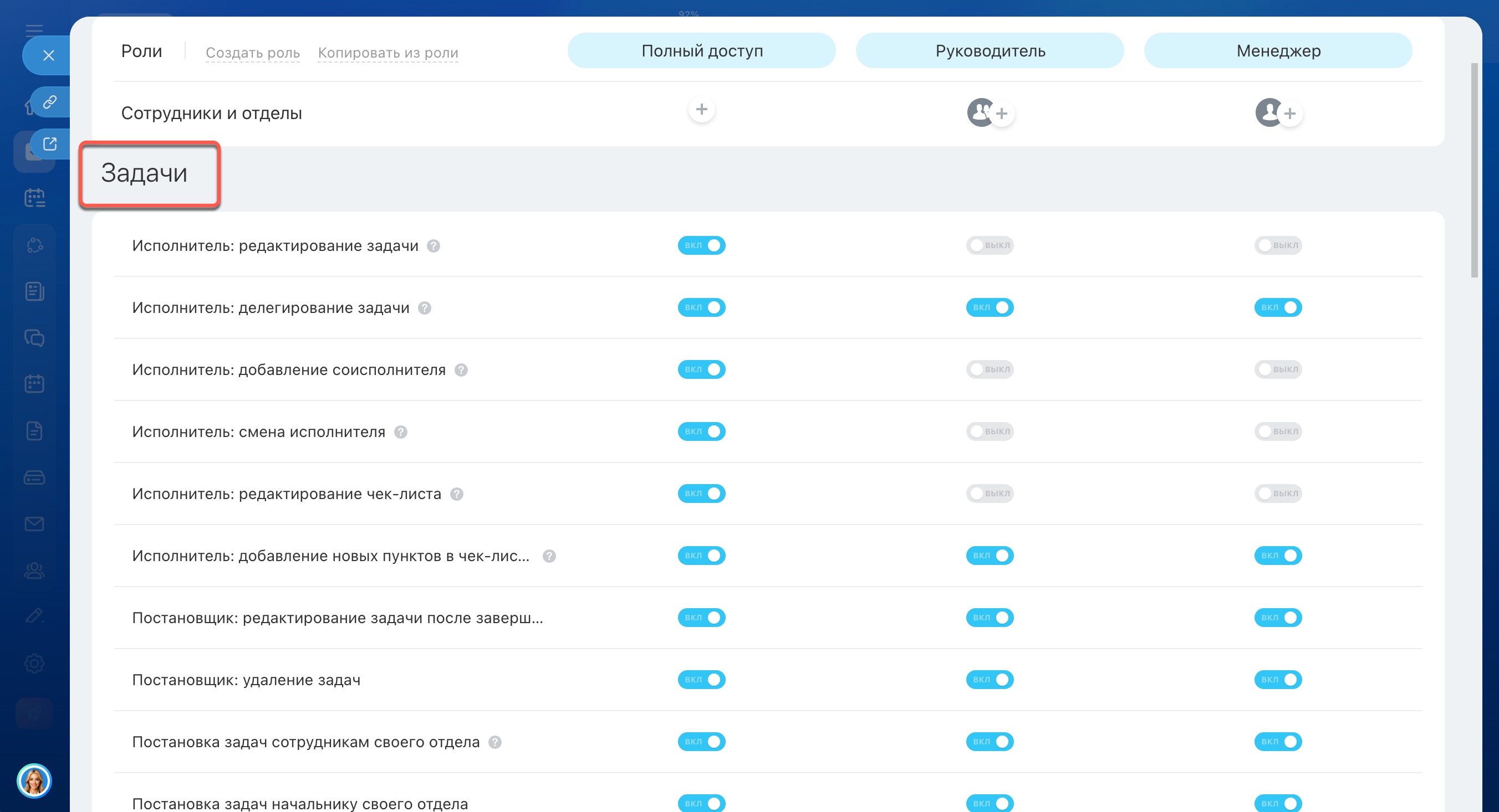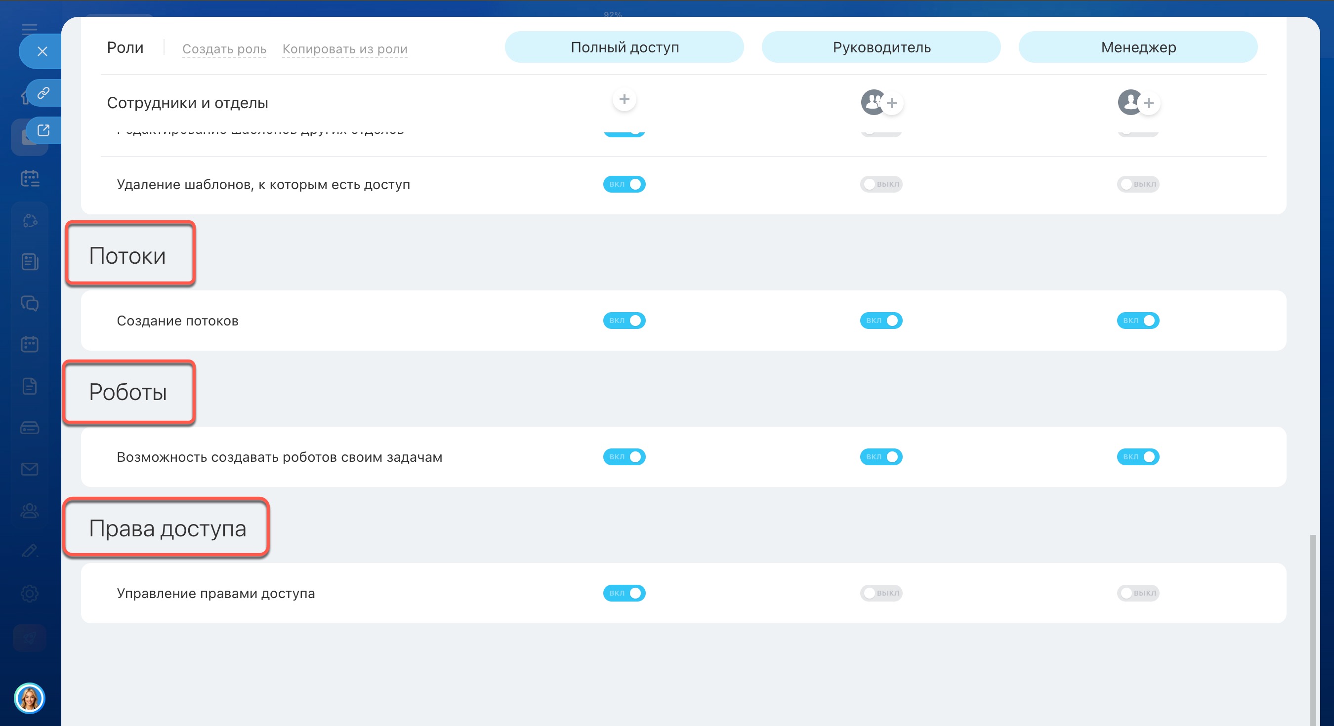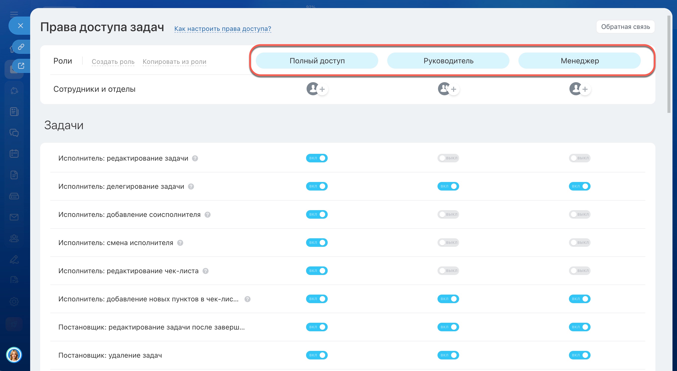 - По умолчанию в настройках прав есть три роли: Полный доступ, Руководитель и Менеджер.