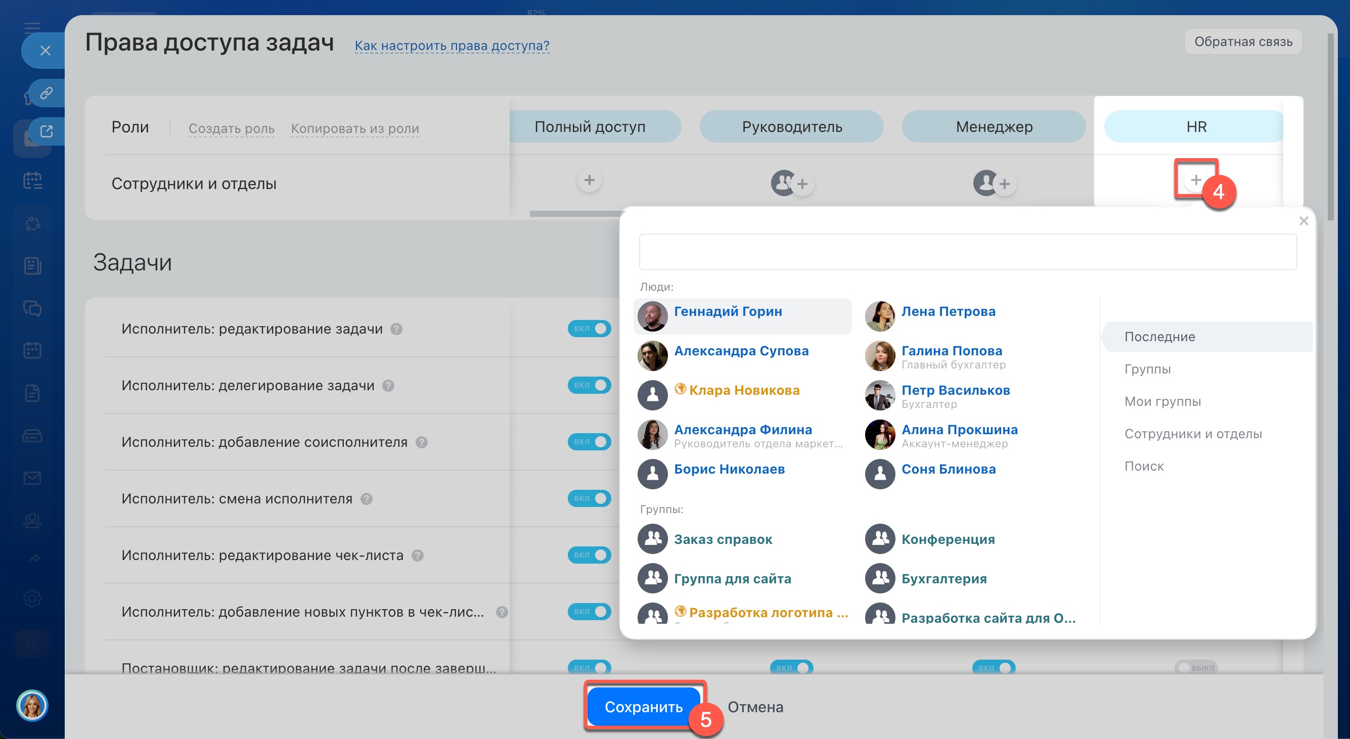 4–5. Назначьте роль HR-специалистам и сохраните настройки.