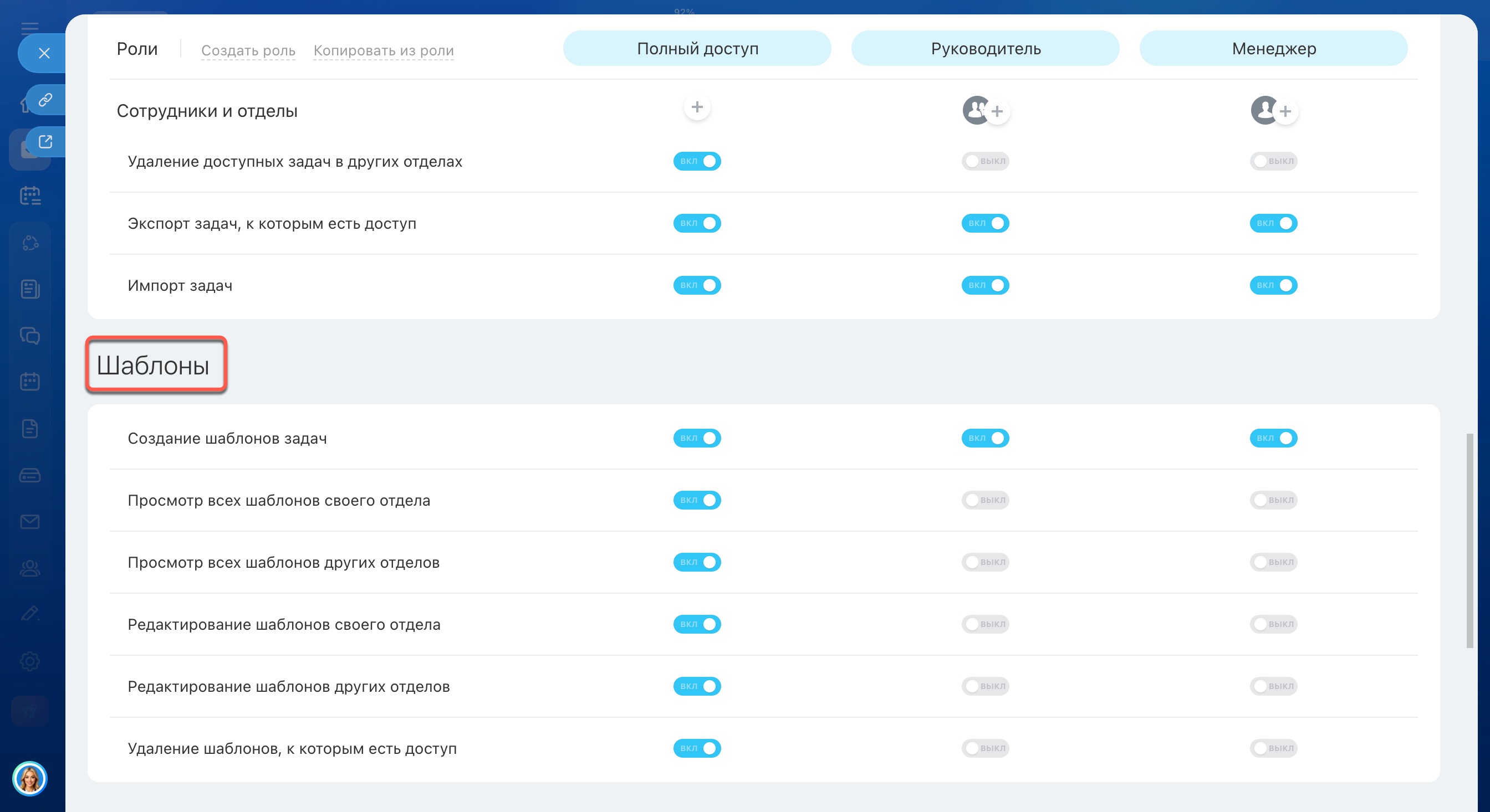 Например, для ведущих менеджеров можно создать отдельную роль. В ней пользователи работают с задачами как обычные менеджеры, но дополнительно могут редактировать и удалять шаблоны задач своего отдела. Так ответственные сотрудники могут быстро обновлять шаблоны, и вся команда сразу работает по актуальному стандарту, без участия руководителя.
