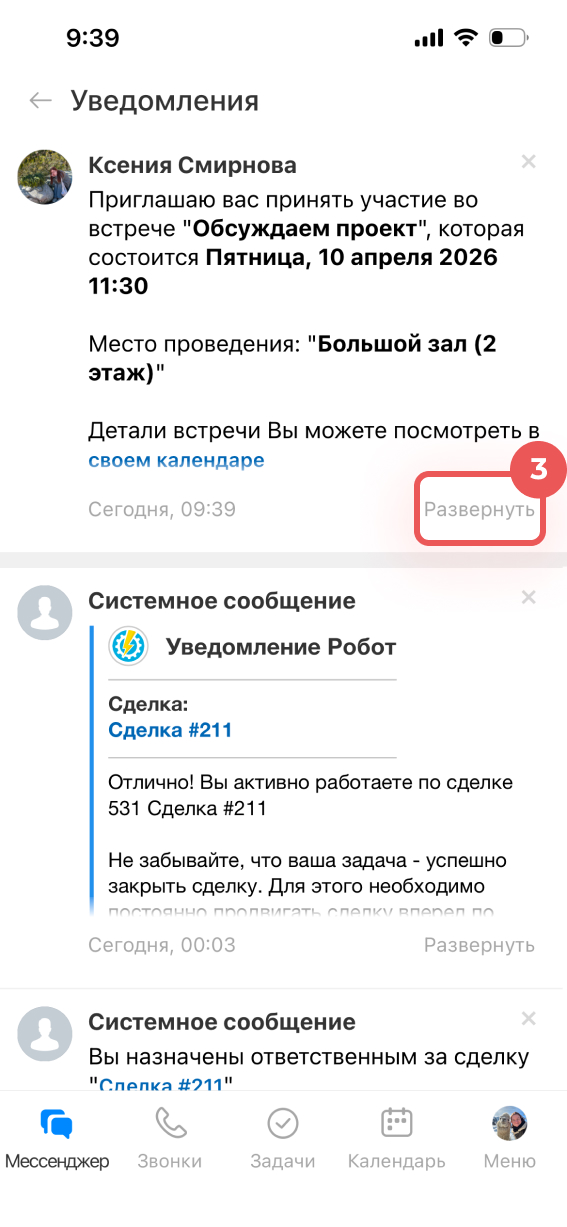 Найдите уведомление о приглашении — в нем указаны название события, дата и место проведения. Нажмите Развернуть.