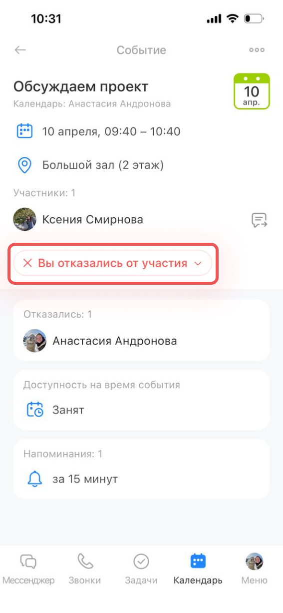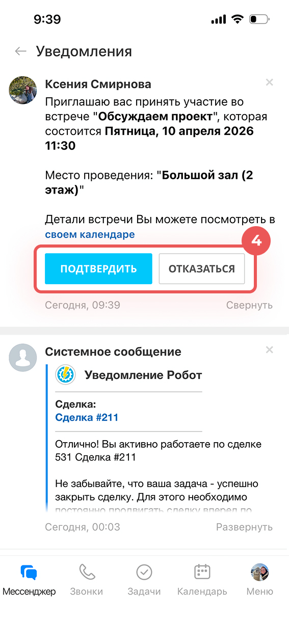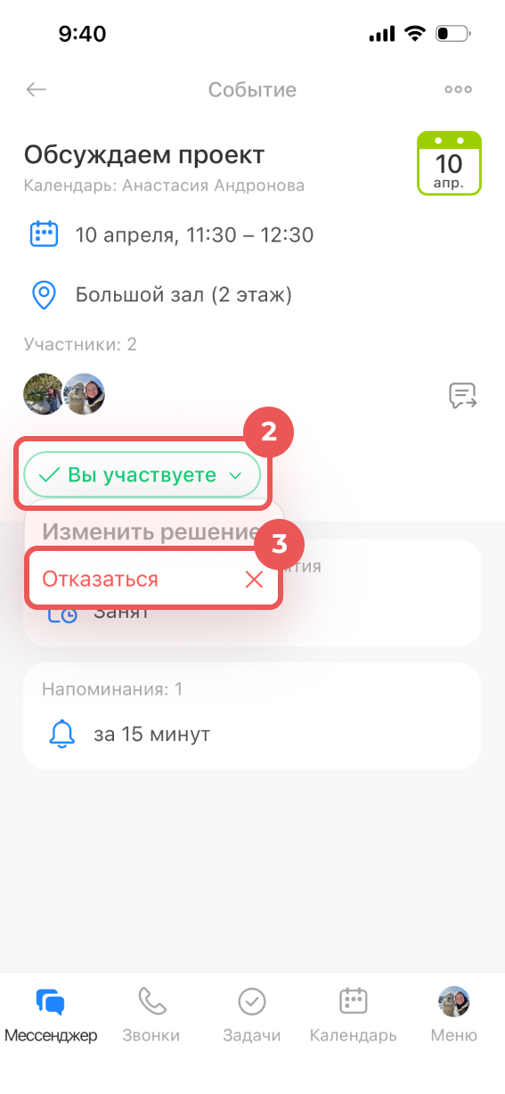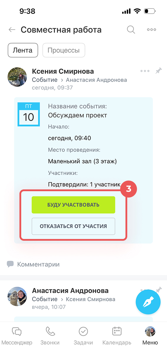 Подтвердить или отклонить участие можно тремя способами: из уведомлений, из ленты или из календаря.