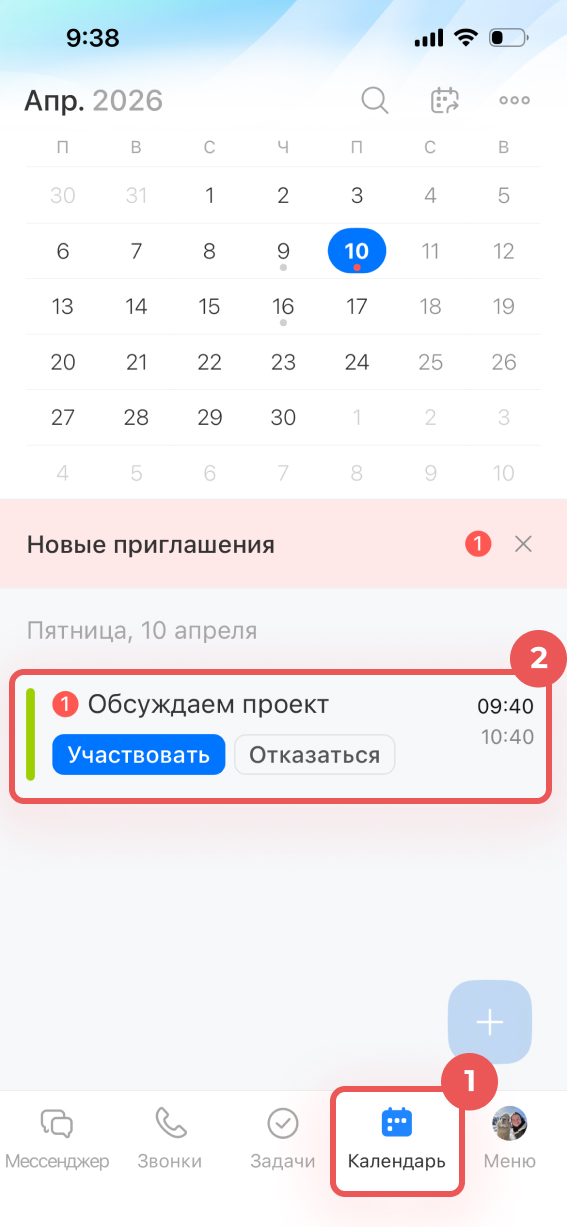 Из календаря. Откройте Календарь. Новые приглашения отображаются отдельным блоком вверху. Нажмите Участвовать или Отказаться.
