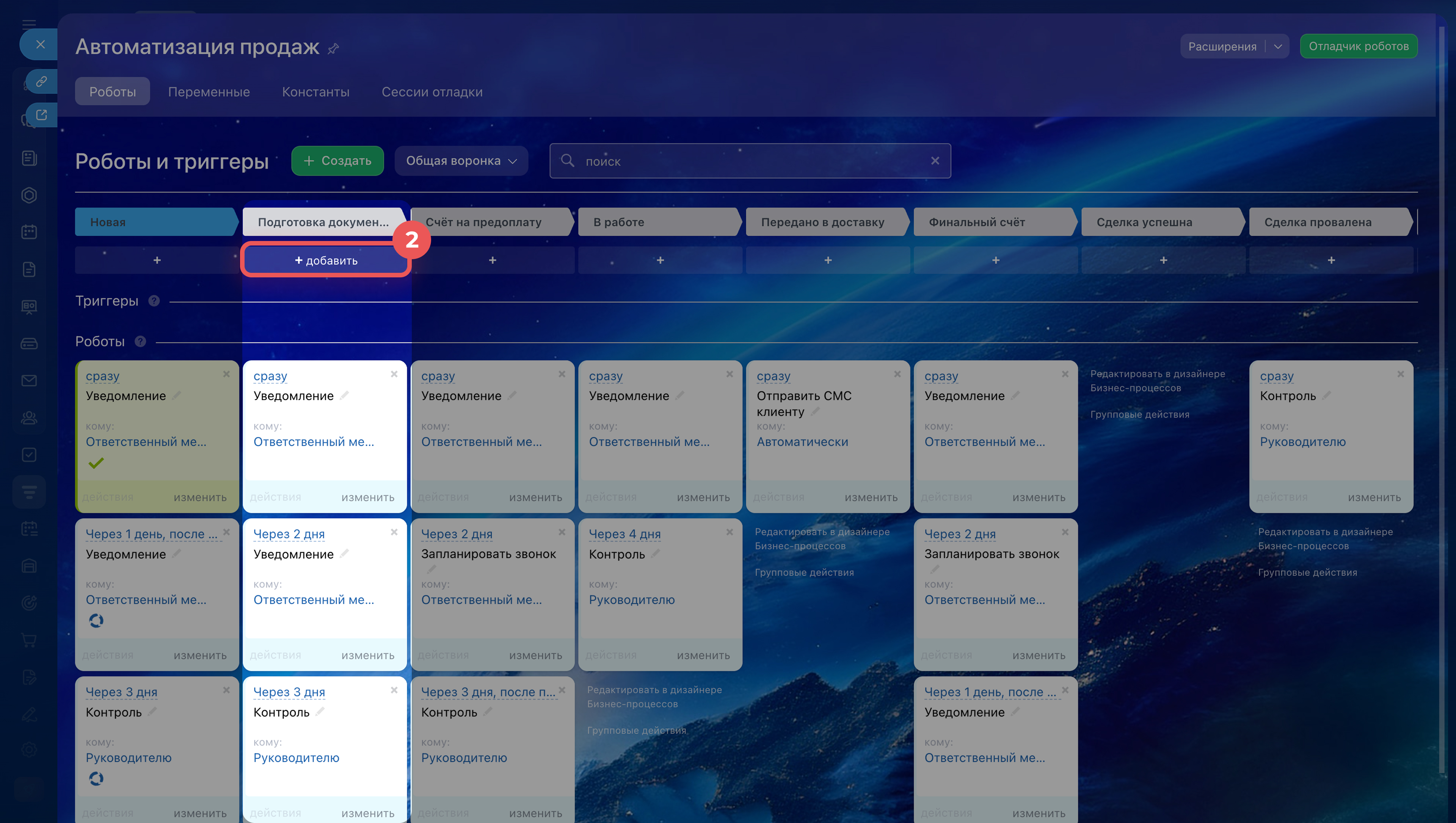 1. В карточке сделки перейдите на вкладку Роботы. Откроется редактор Автоматизация продаж.