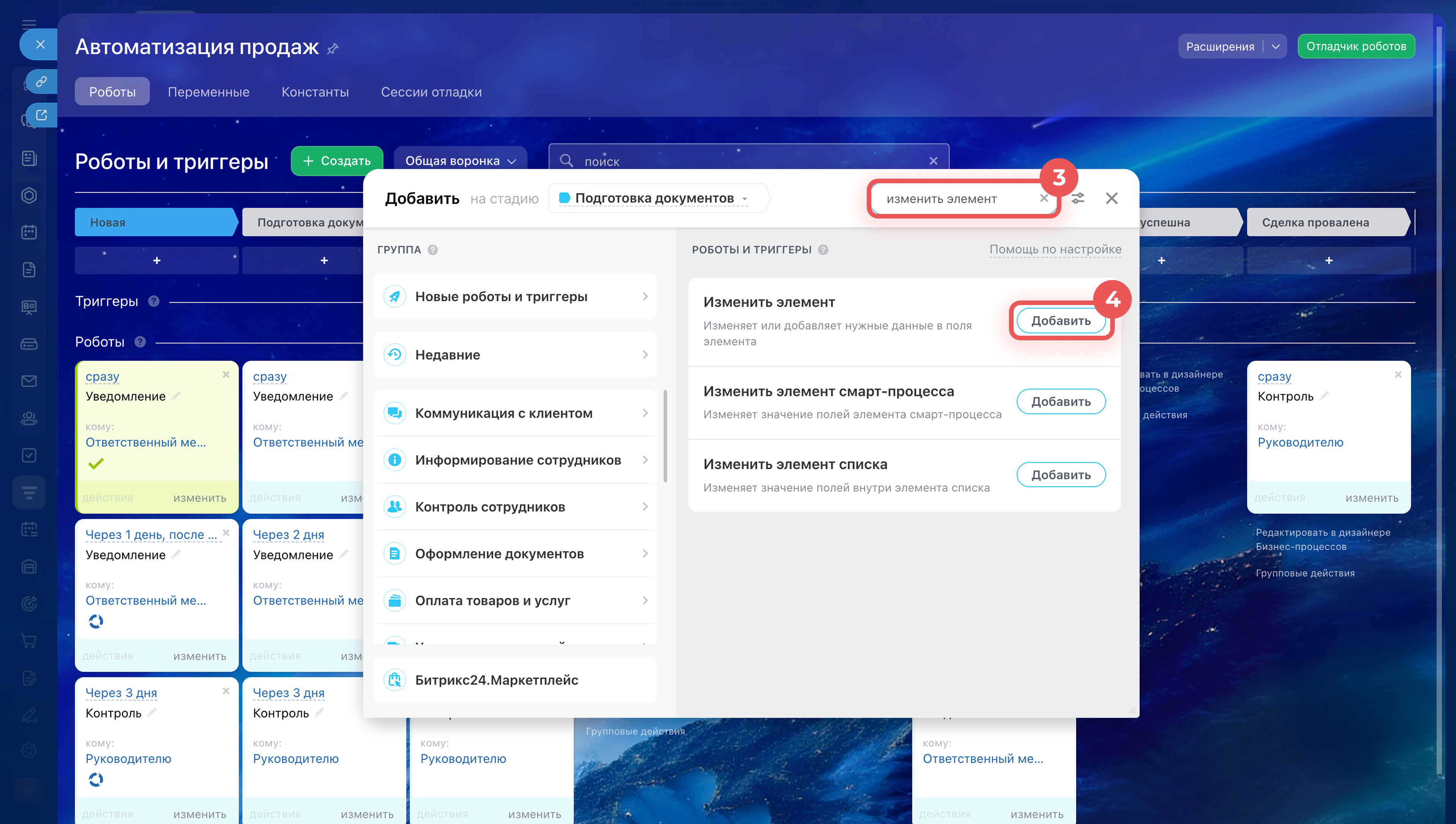 3–4. В поисковой строке найдите робота Изменить элемент. Нажмите Добавить.