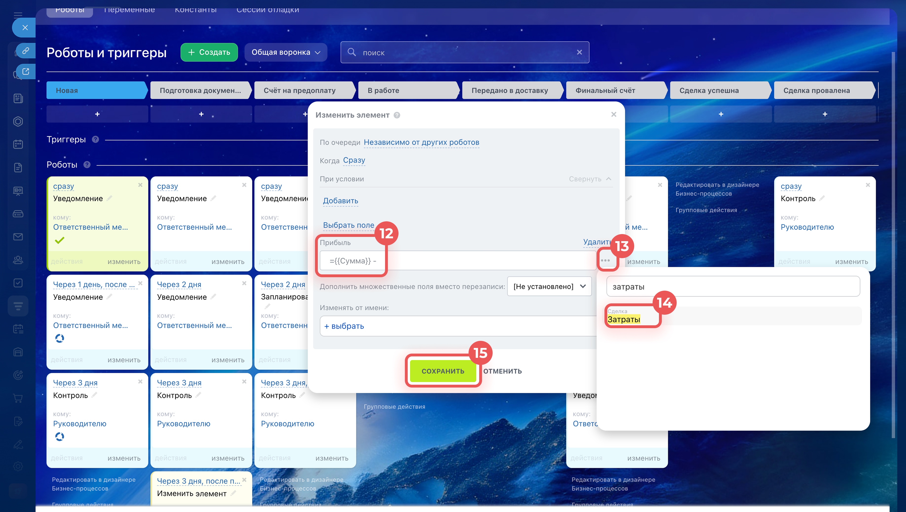 ={{Сумма}} - {{Затраты}}. - Когда менеджер переведет сделку на эту стадию и внесет затраты, робот автоматически посчитает прибыль и запишет результат в карточку.