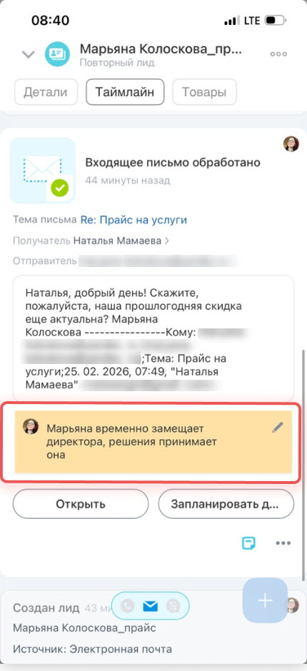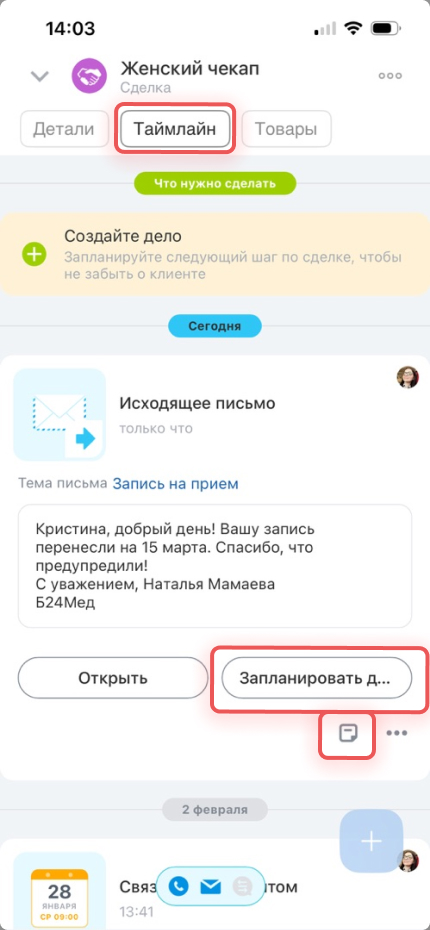 - К письму можно добавить заметку, запланировать дело или закрепить его в карточке, чтобы не потерять важную переписку.