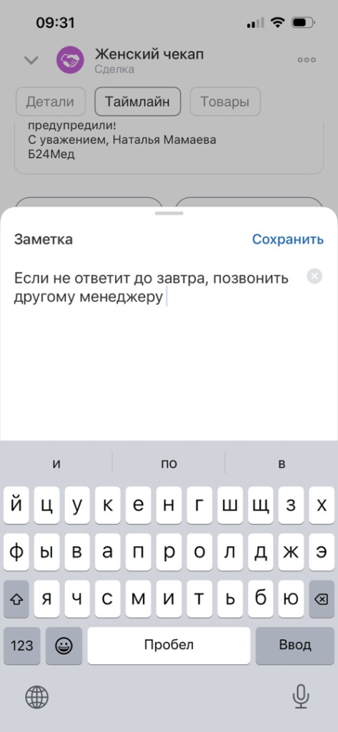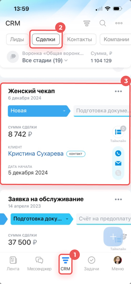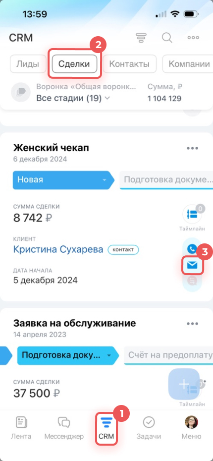 Из карточки CRM. Этот способ удобен, если вы уже работаете с карточкой и хотите видеть всю историю общения с клиентом.