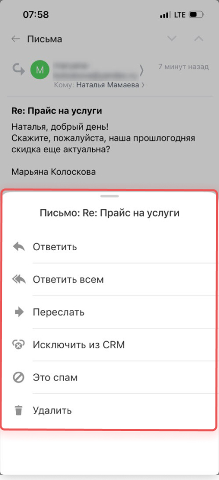 - Из входящего письма можно ответить или переслать письмо, а также отметить его как спам, исключить из CRM или удалить.