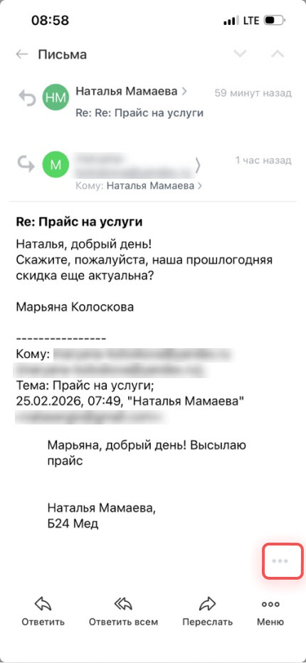 Ответить. Из входящего письма можно ответить клиенту, ответить всем, если в письме было несколько получателей, или переслать письмо. Письмо можно отметить как спам или удалить.