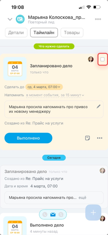 Выполнить дело по письму. После того как вы запланировали дело по письму, его можно выполнить — поставьте галочку в чекбокс рядом с вашим аватаром.