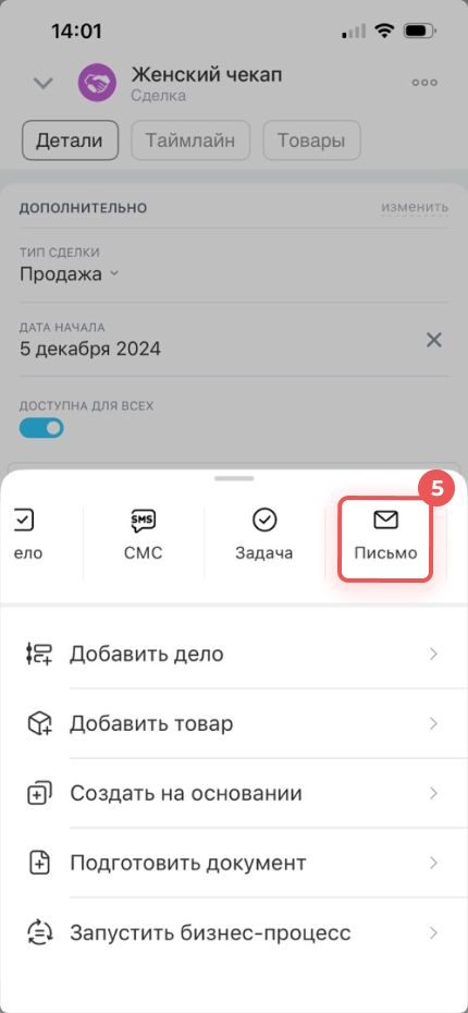- Написать письмо можно из списка элементов CRM или из карточки.