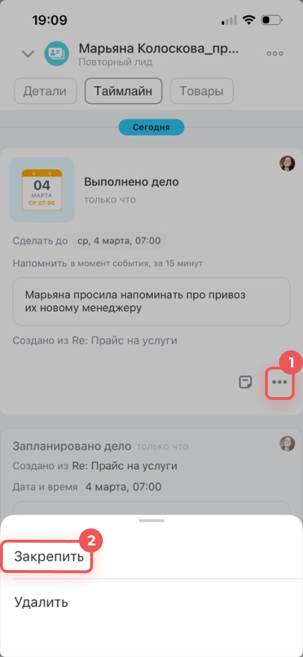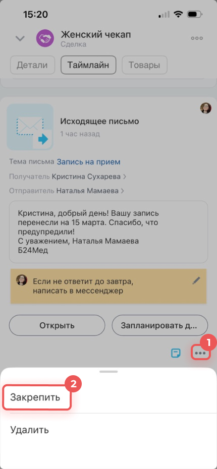 В таймлайне в записях о письме или деле нажмите Три точки (...) > Закрепить.