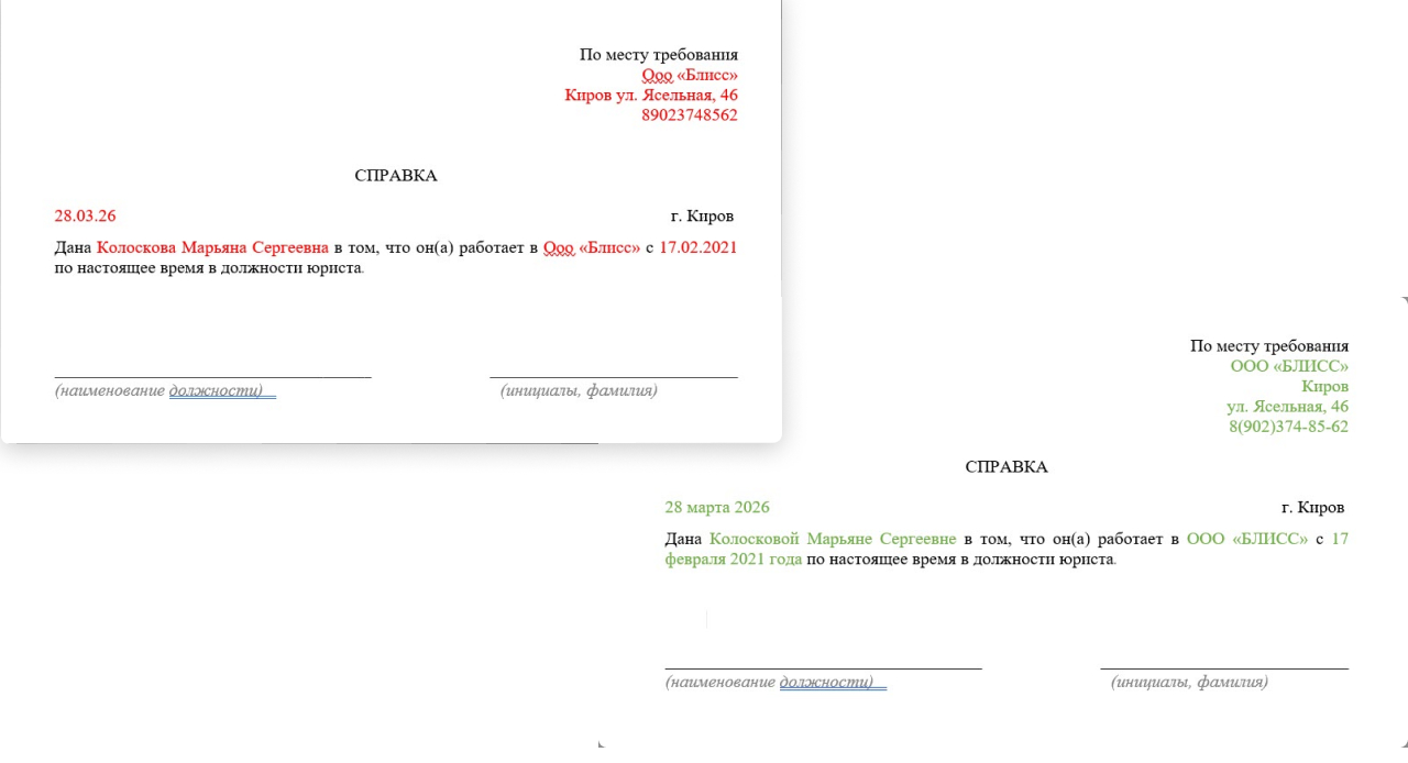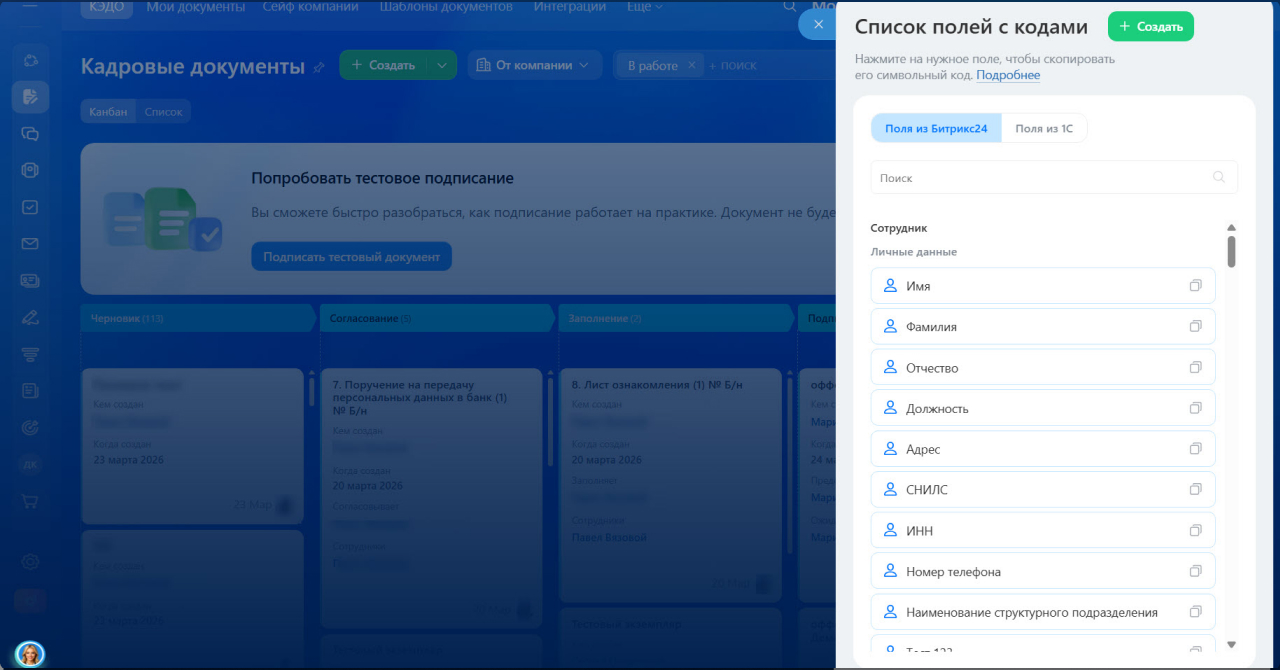 Символьные коды. В шаблоны документов КЭДО можно добавлять символьные коды — они автоматически подставляют данные из полей Битрикс24 или 1С: имя сотрудника, реквизиты компании, дату и другие. Заполните поле один раз и его значение появится в документе. Сотрудник при подписании видит уже готовый заполненный документ.