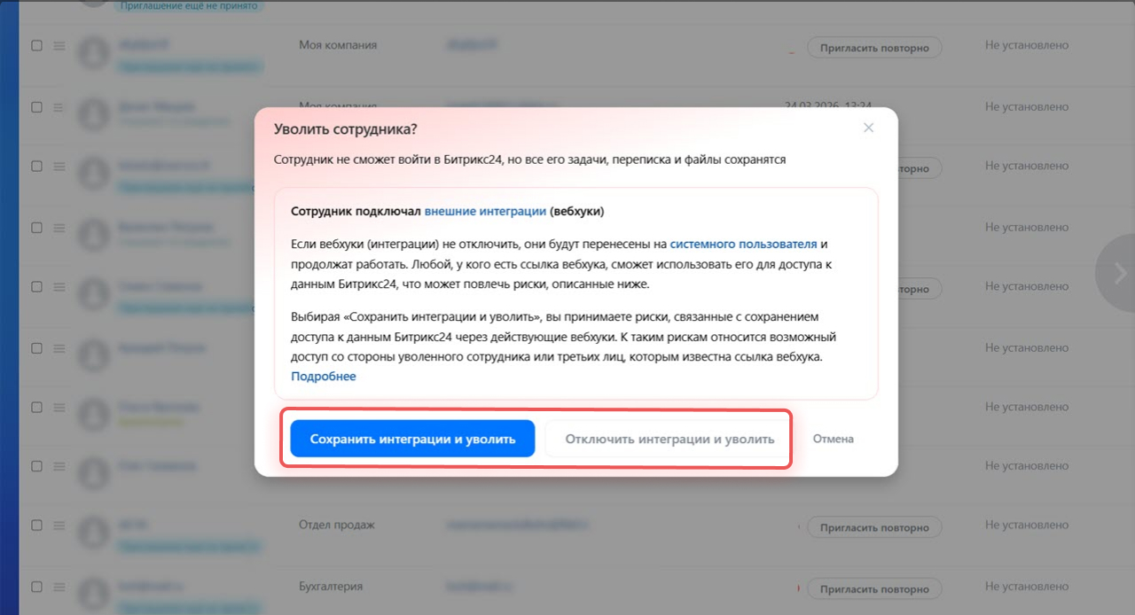 При увольнении сотрудника с активными интеграциями Битрикс24 покажет уведомление и предложит два варианта: