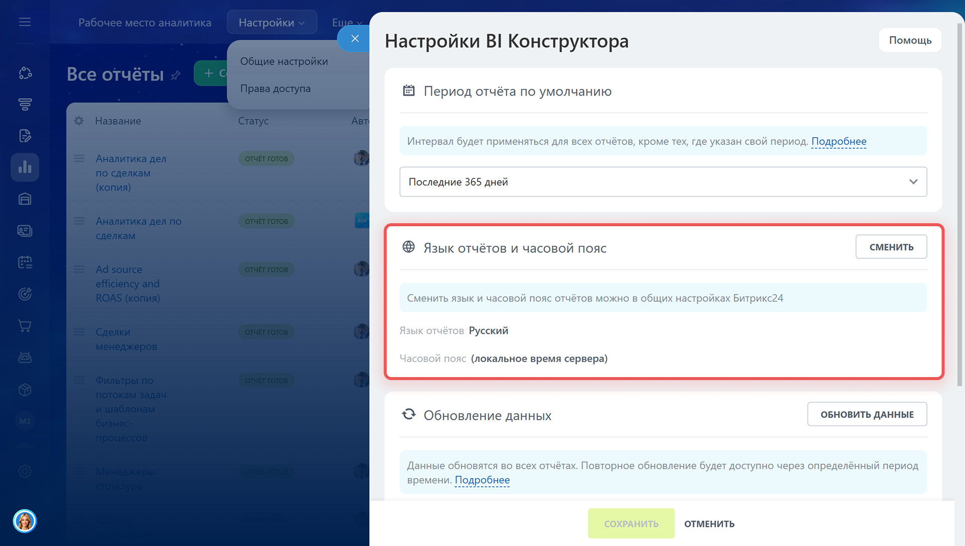 BI Конструктор: выбор часового пояса и языка отчетов, новый набор данных