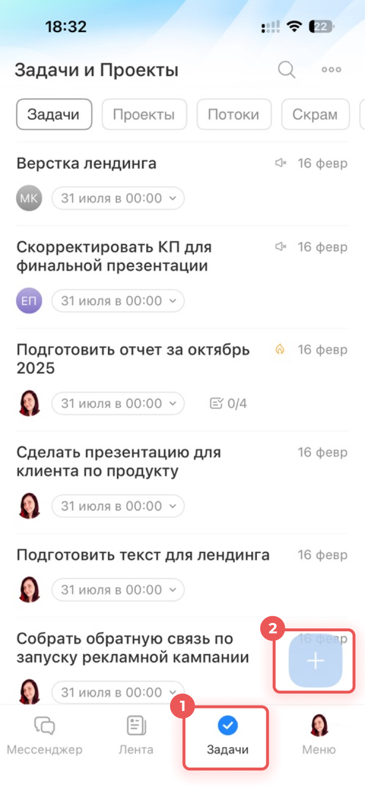 1–2. В нижнем меню нажмите Задачи > Плюс (+).
