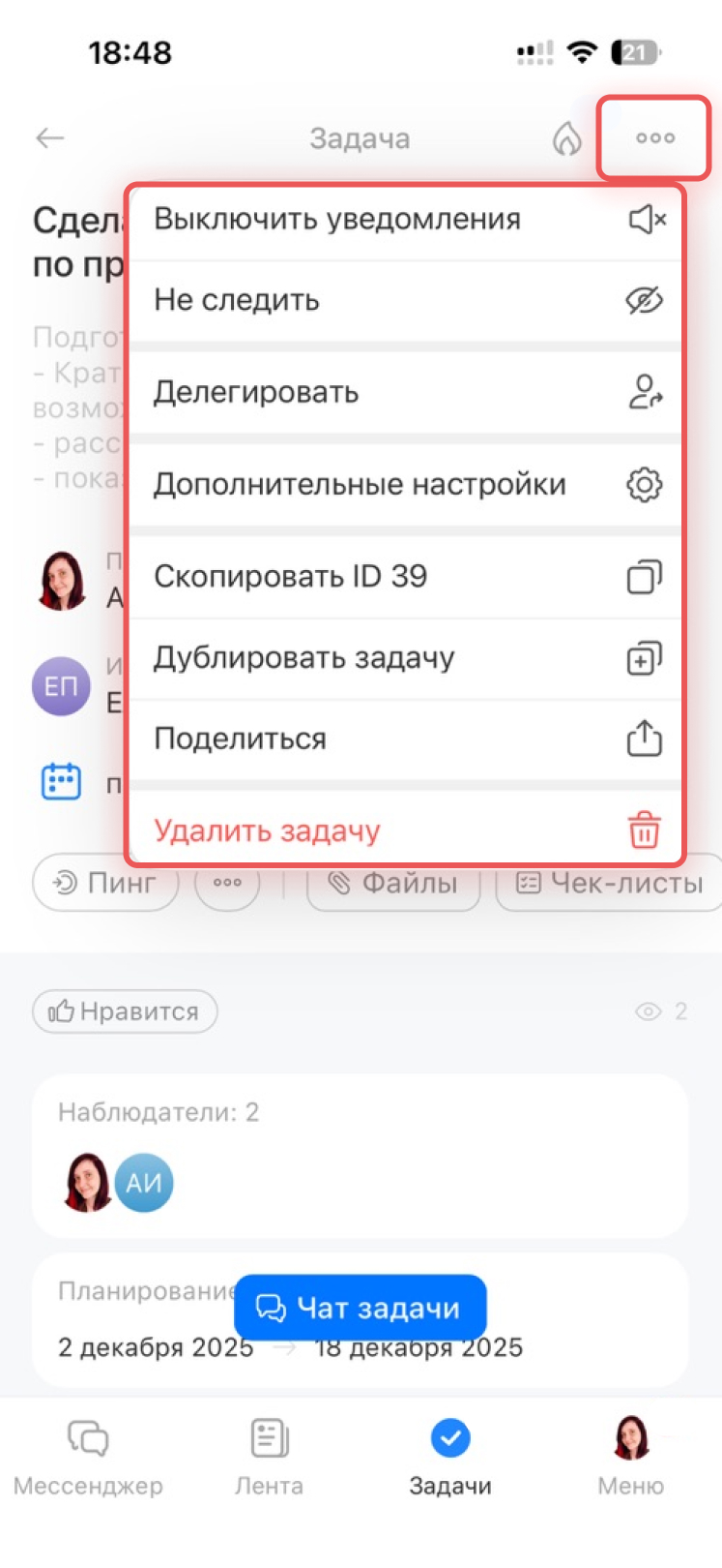 - Скопировать ID — если нужно отправить номер задачи коллеге или в поддержку.