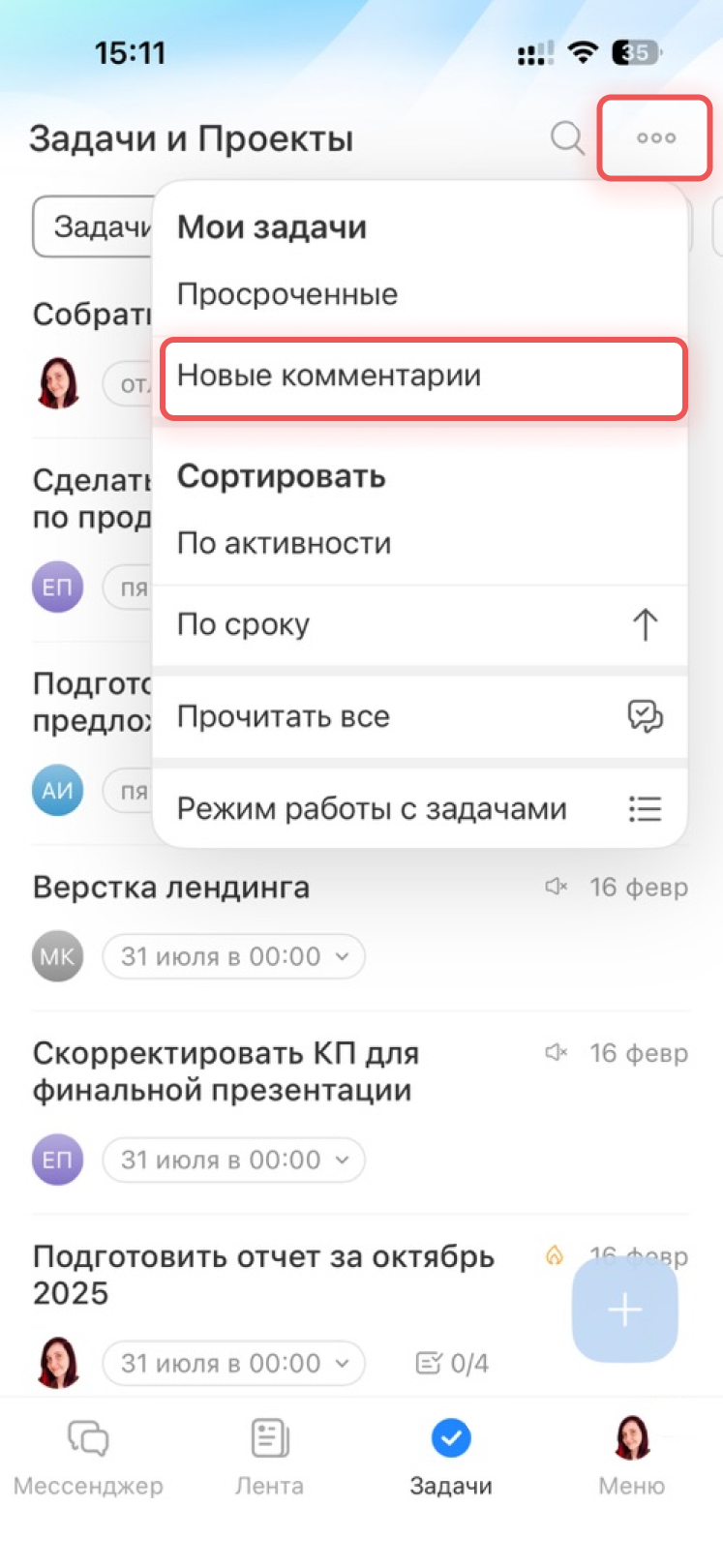 Фильтр по новым комментариям показывает задачи, в которых появились новые сообщения. Нажмите Три точки (...) > Новые комментарии.