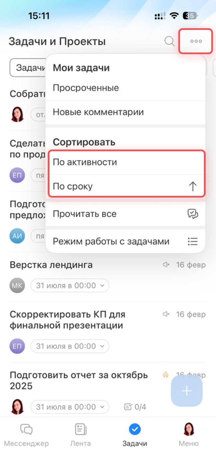Сортировка помогает быстрее находить важные задачи и расставлять приоритеты. Нажмите Три точки (...) и выберите нужный вариант сортировки: